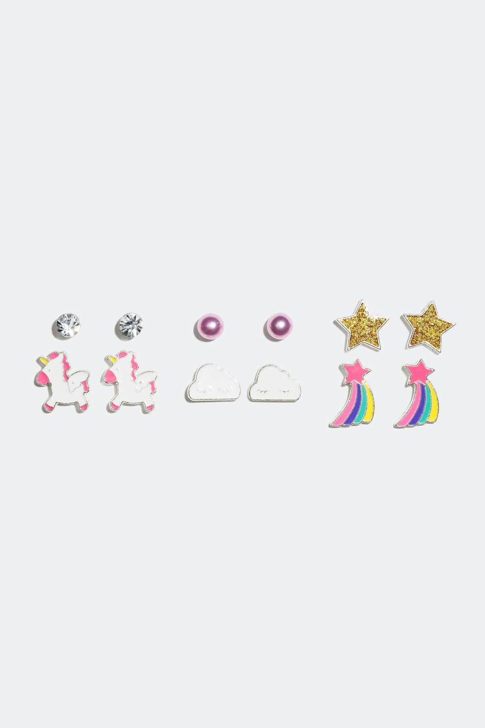 6-pak farverige øreringe til børn. Pakken indeholder små ørestikker med skyer, enhjørninger, stjerner, glassten og perler.