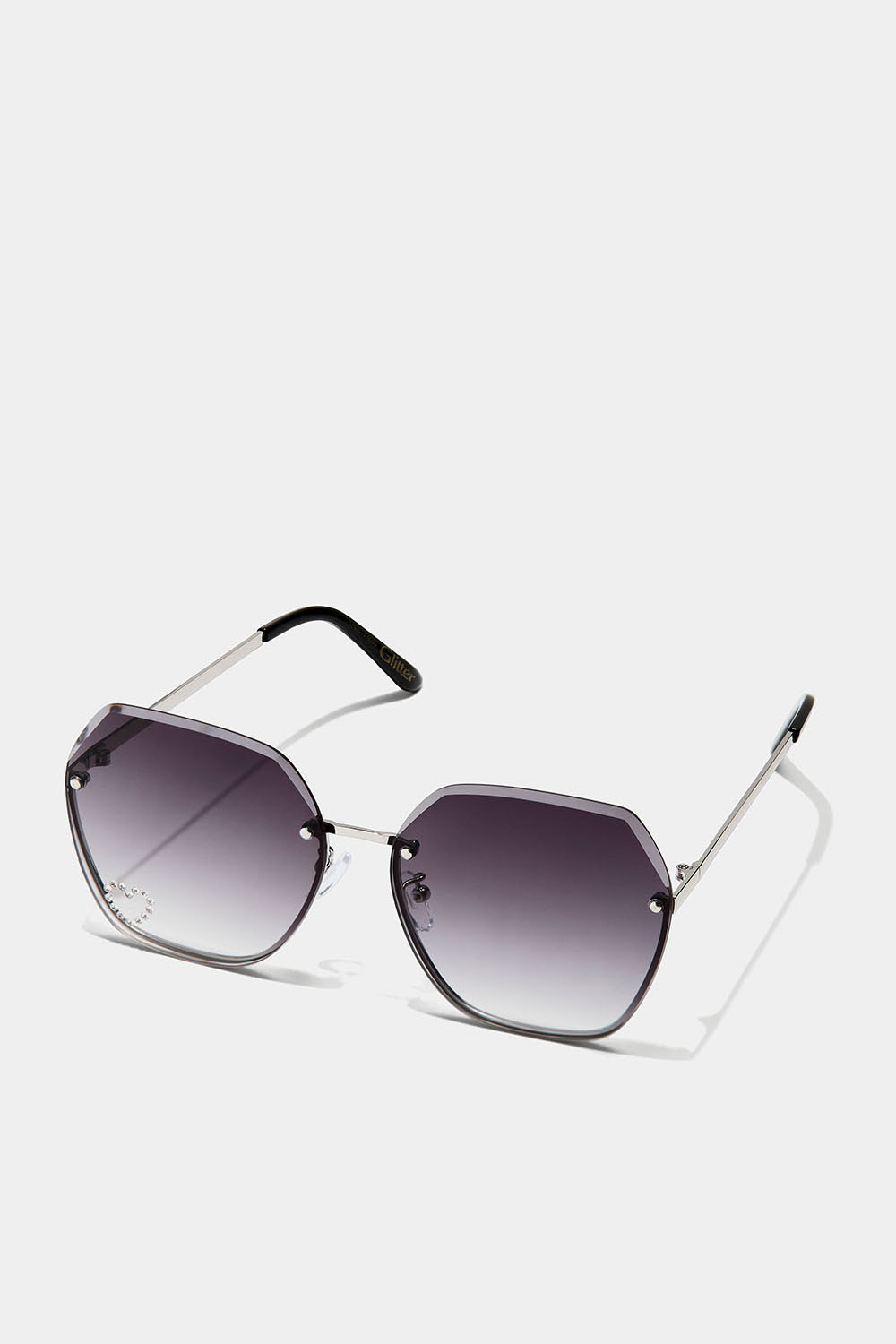 70'er-inspirerede, overdimensionerede solbriller med tonede glas og et dekorativt rhinstenhjerte på glasset. Glasset er vinklet i toppen for at give en ekstra retrofølelse.