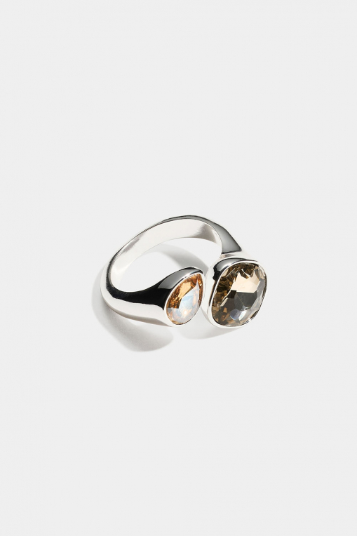 Ring i sølvfarvet metal med to glassten. En lysebrun firkantet og en beige i dråbeform.