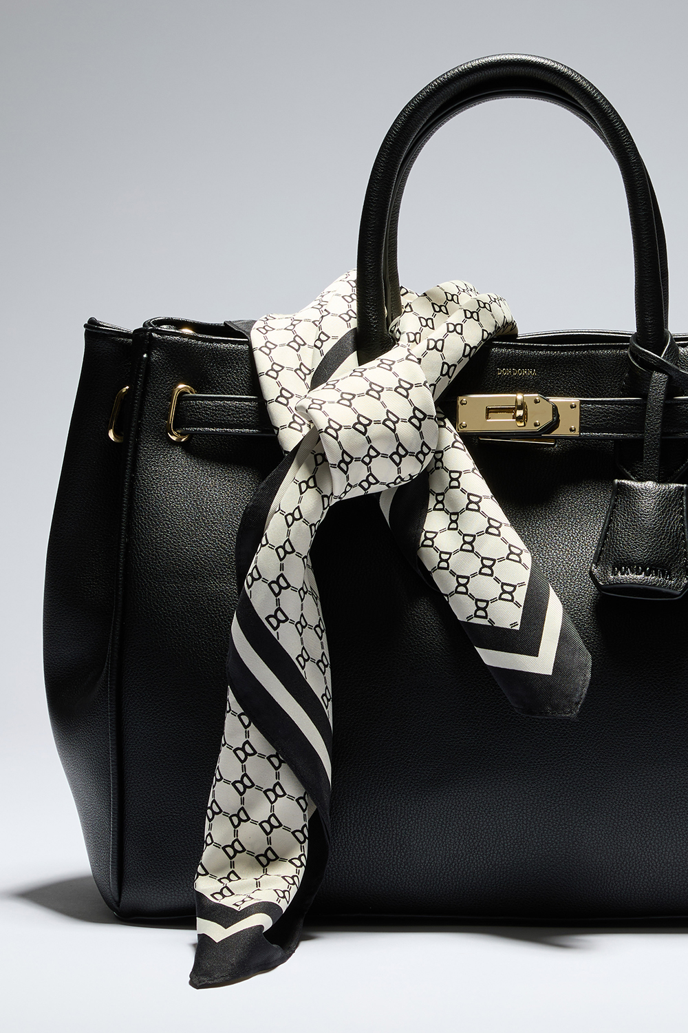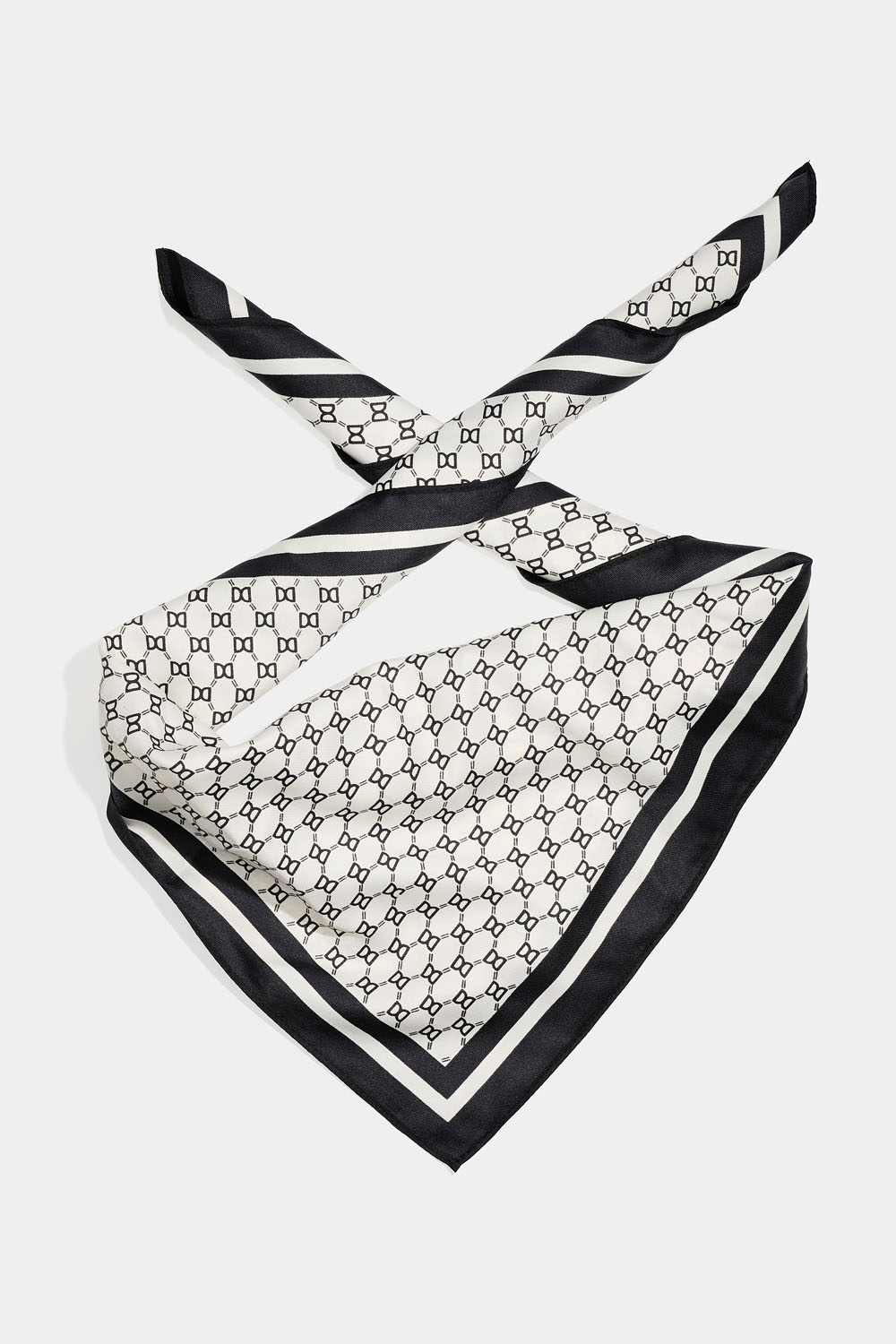 Firkantet tørklæde i silkeimitation med sort og hvidt DD-mønster og sort kant.