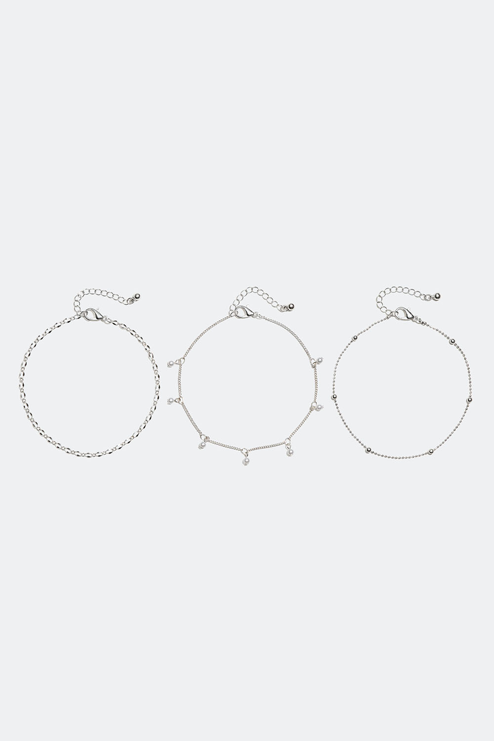 3-pak ankelkæder. Den ene med hvide perler, den anden med metalkugler og den tredje med et hamret design.