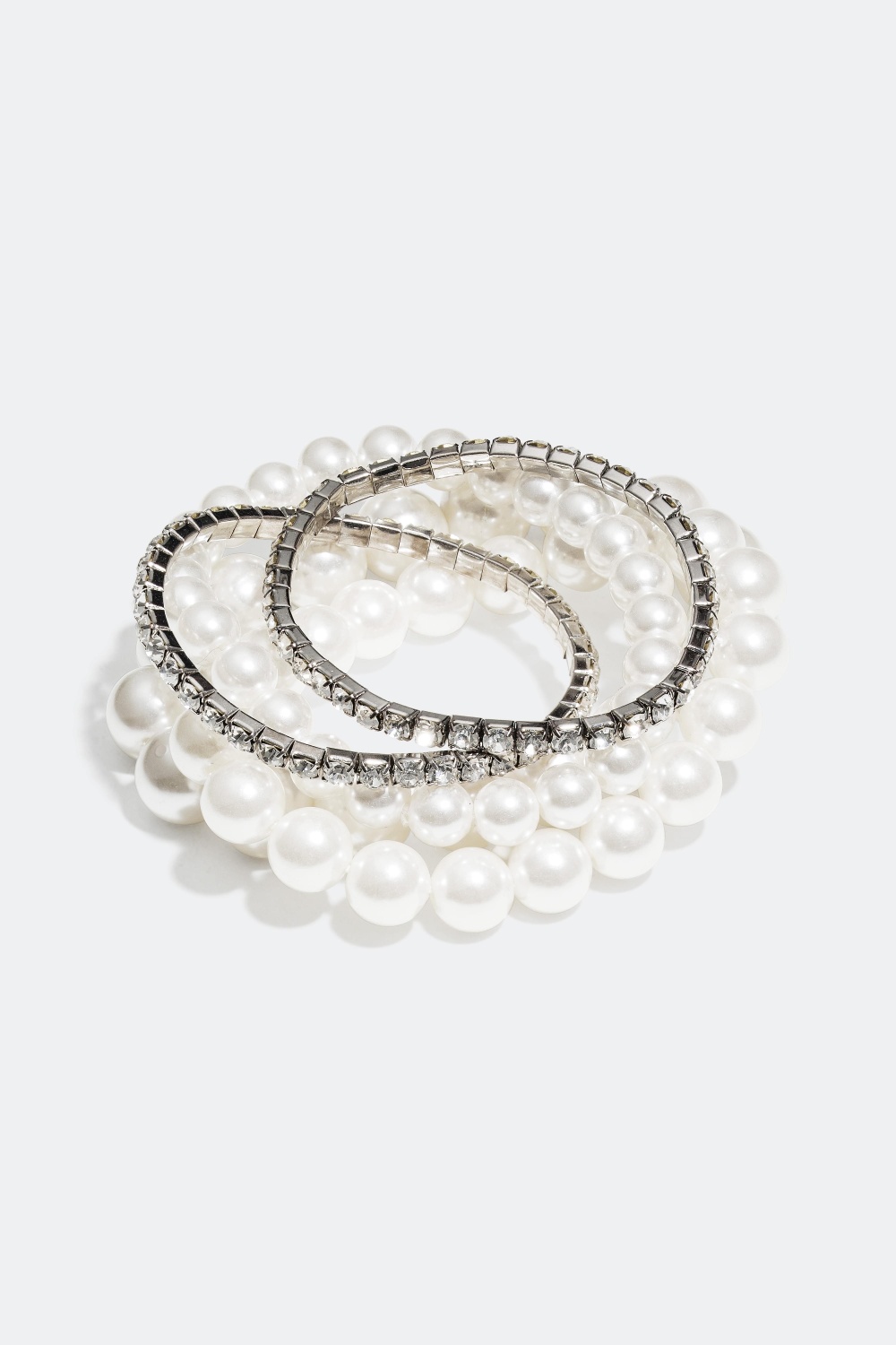 Armbånd, 5 stk pr pakke - Fem fine armbånd, hvor tre er med hvide plastperler og to med similisten.