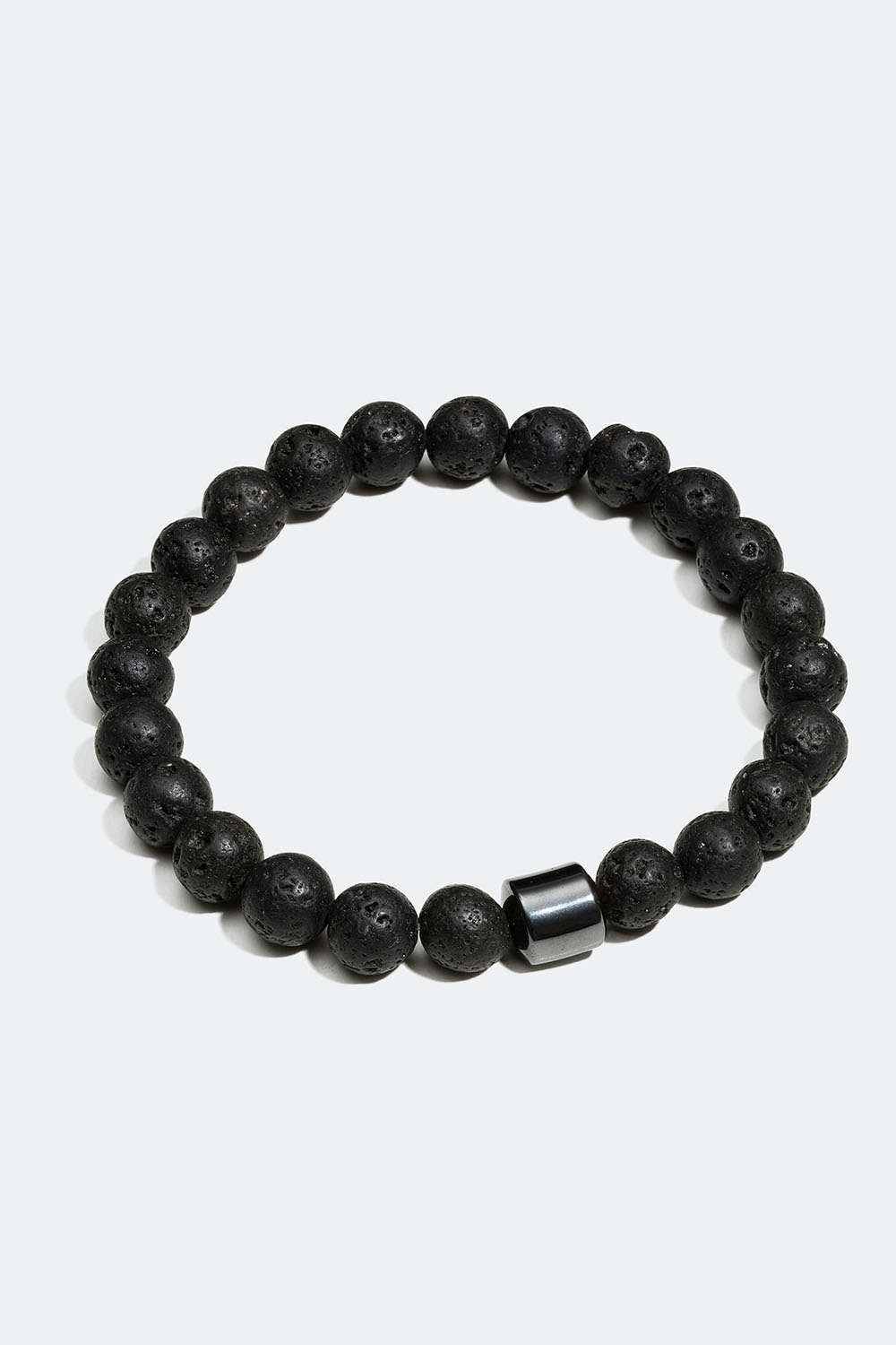 Elastisk armbånd med runde natursten i 'black lava' og en perledetalje i mørkt metal. Et stilrent armbånd, der er perfekt til at kombinere med flere armbånd.