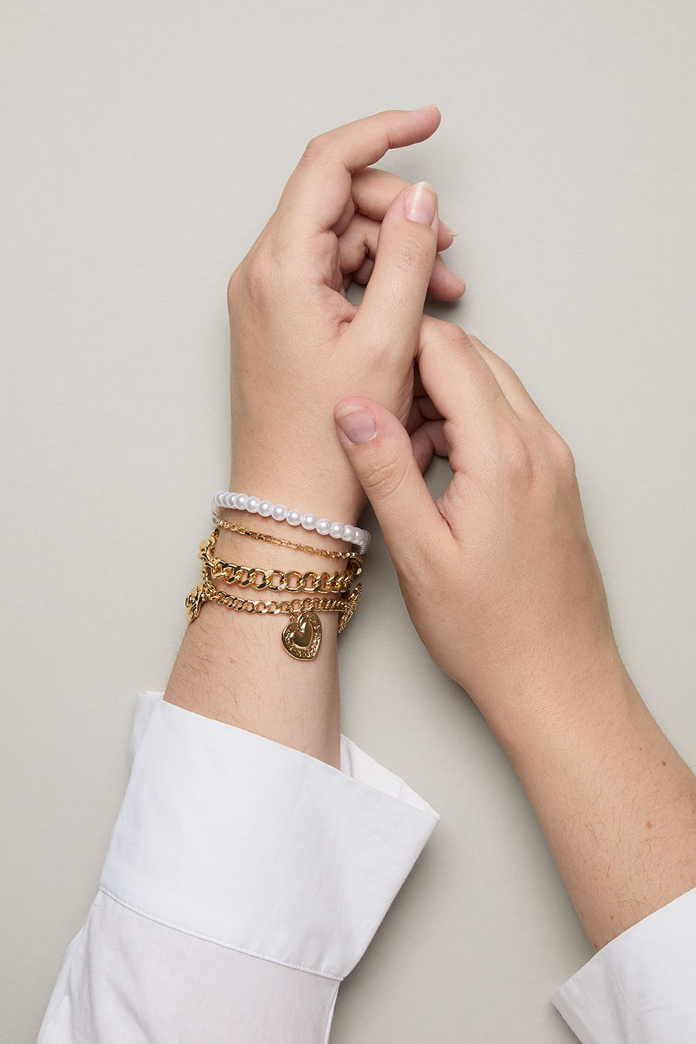 Armbånd med tre kæder i forskellige designs og et perleled. Armbåndet har tre hængende charms i form af hjerter og en rose.