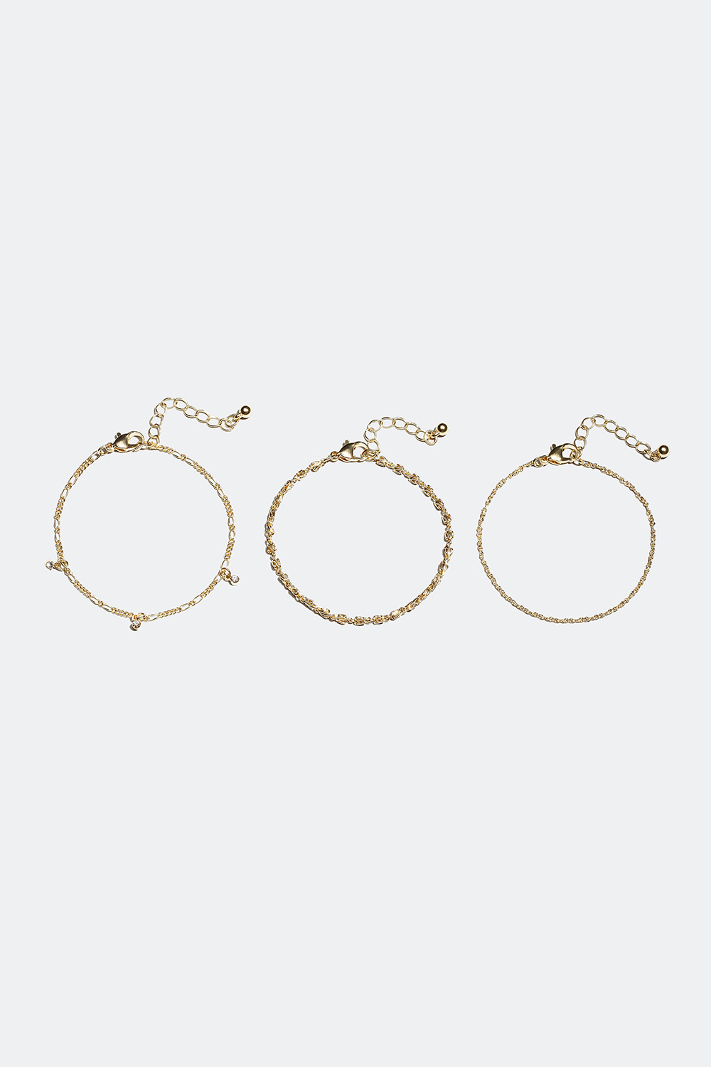 Pakke med 3 tynde kædearmbånd i metal med forskellige kædedesign og dekorative glassten på et af armbåndene. Armbåndene gør sig flot sammen, men kan også bruges separat eller kombineres med andre armbånd.