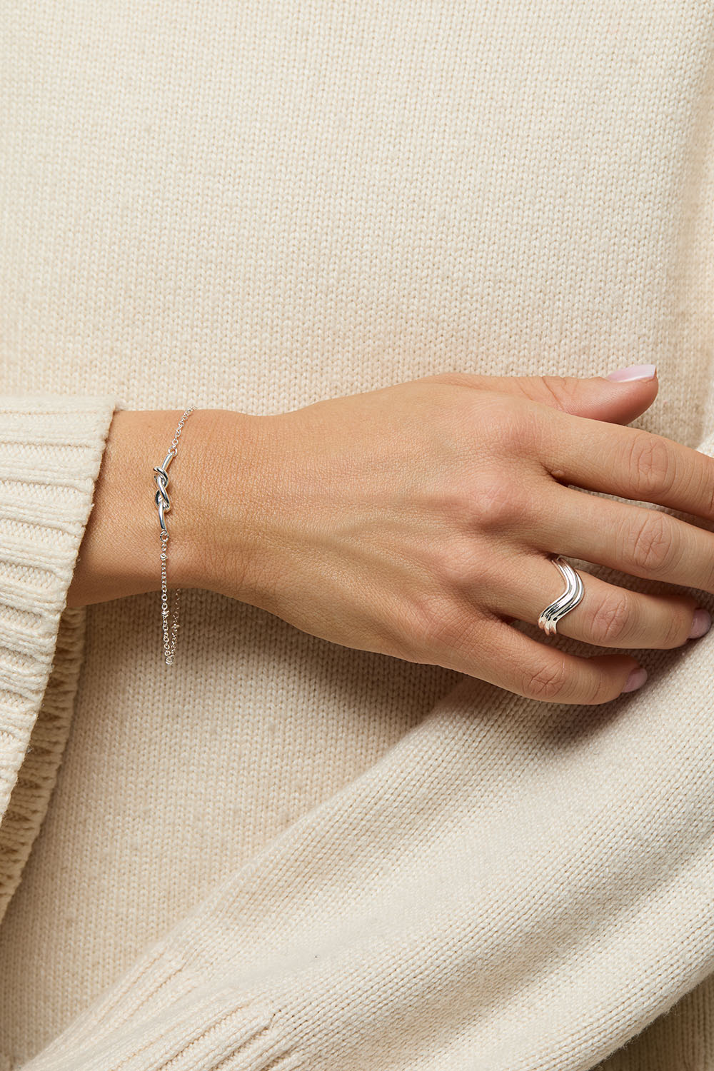 Stilrent armbånd i metal med kæde og dekorativ knudedetalje.