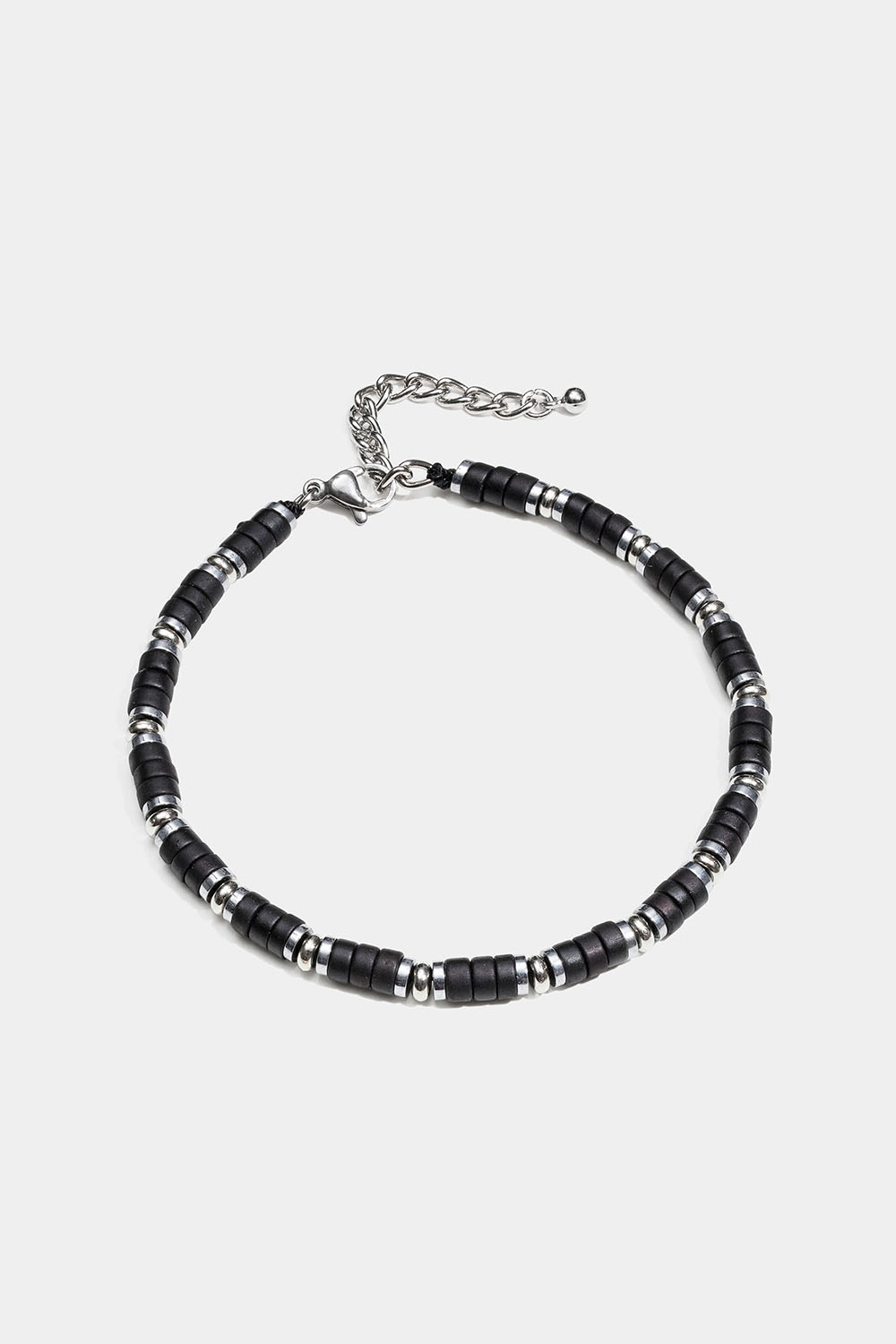 Armbånd med mørke sølvfarvede metalperler og matsort syntetisk sten.