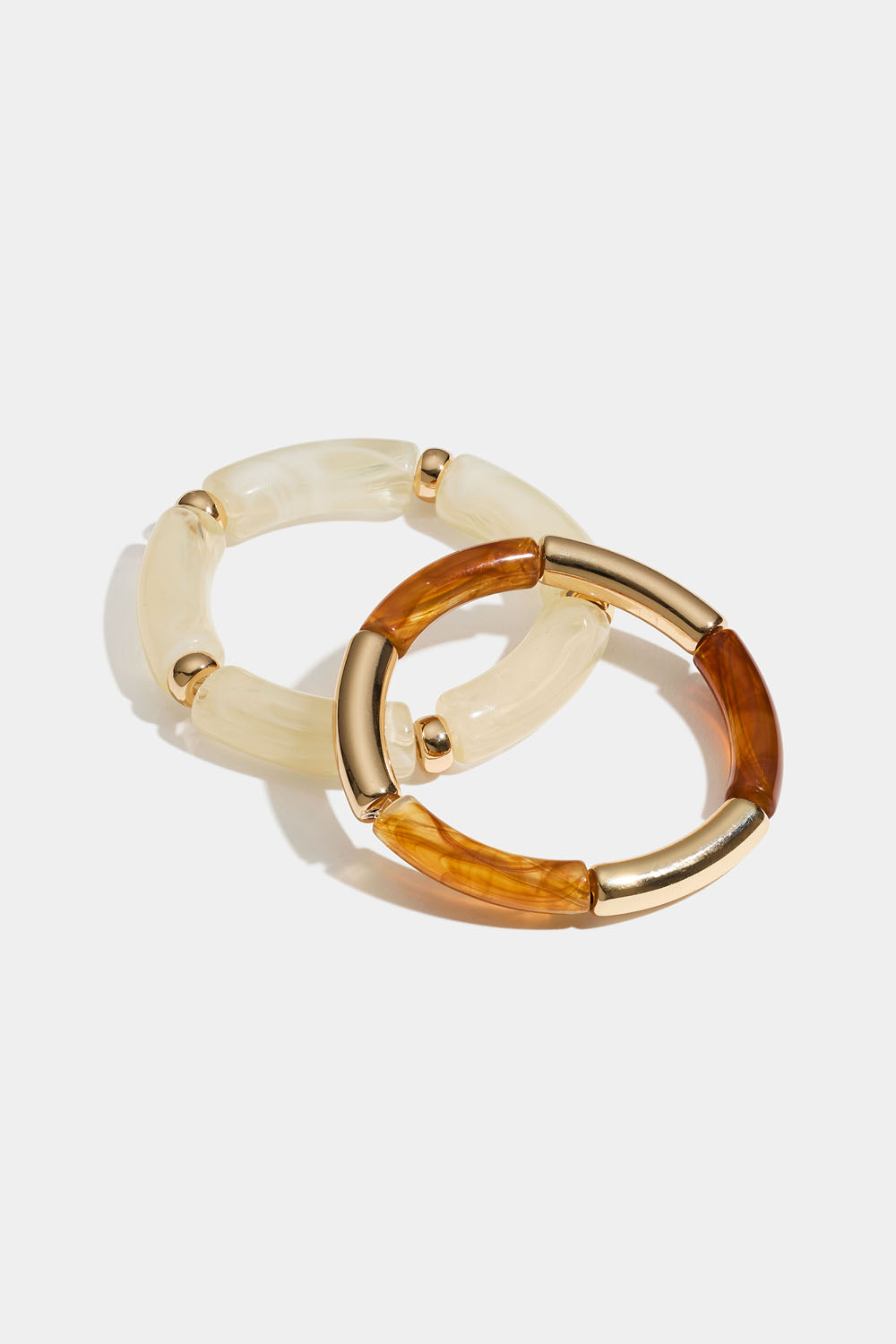 2-pak armbånd, hvoraf det ene har cylindriske led i imiteret brunt rav, blandet med guldfarvede led. Det andet armbånd har beige led og guldfarvede detaljer. Begge er på tråd med træk.