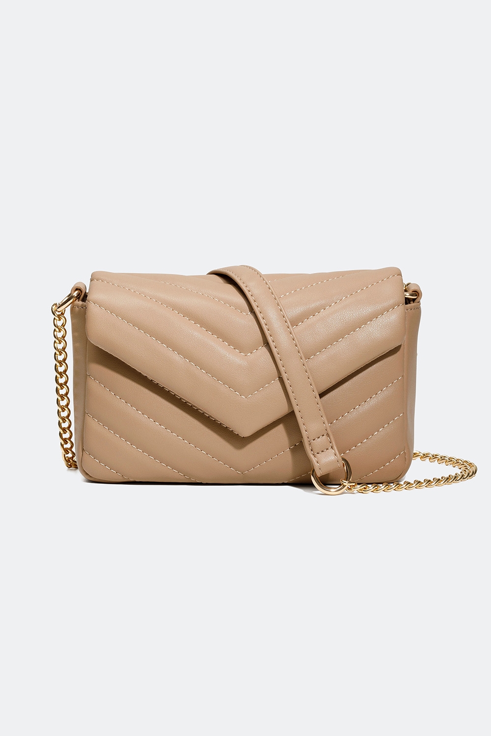 Lille, beige skuldertaske i kunstlæder med quiltet v-mønster. Tasken har en længere skulderrem i guldfarvet metal og beige kunstlæder. Tasken har en lås, der lukkes med en magnetisk knap, og indeni er der et mindre rum, der kan lukkes med lynlås. En stilren taske, der nemt kan matches med alle outfits og har den perfekte størrelse til dine vigtigste ejendele.