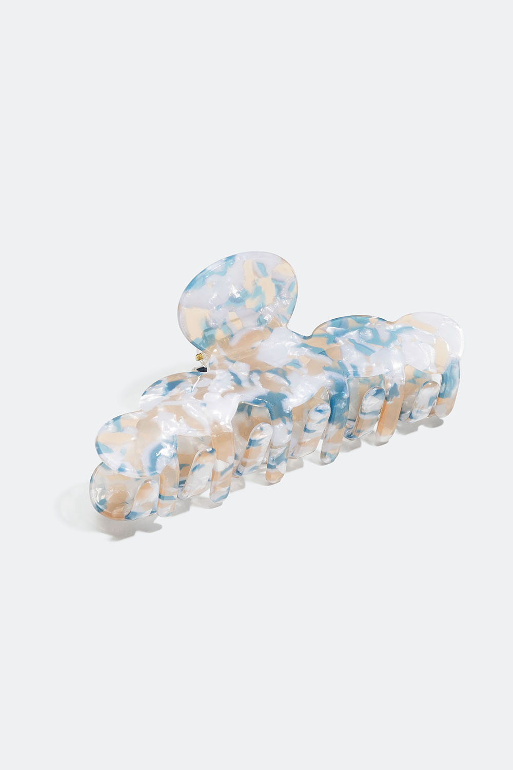 Blank hårklemme med meleret mønster i blå og hvid og bølgeformede kanter.