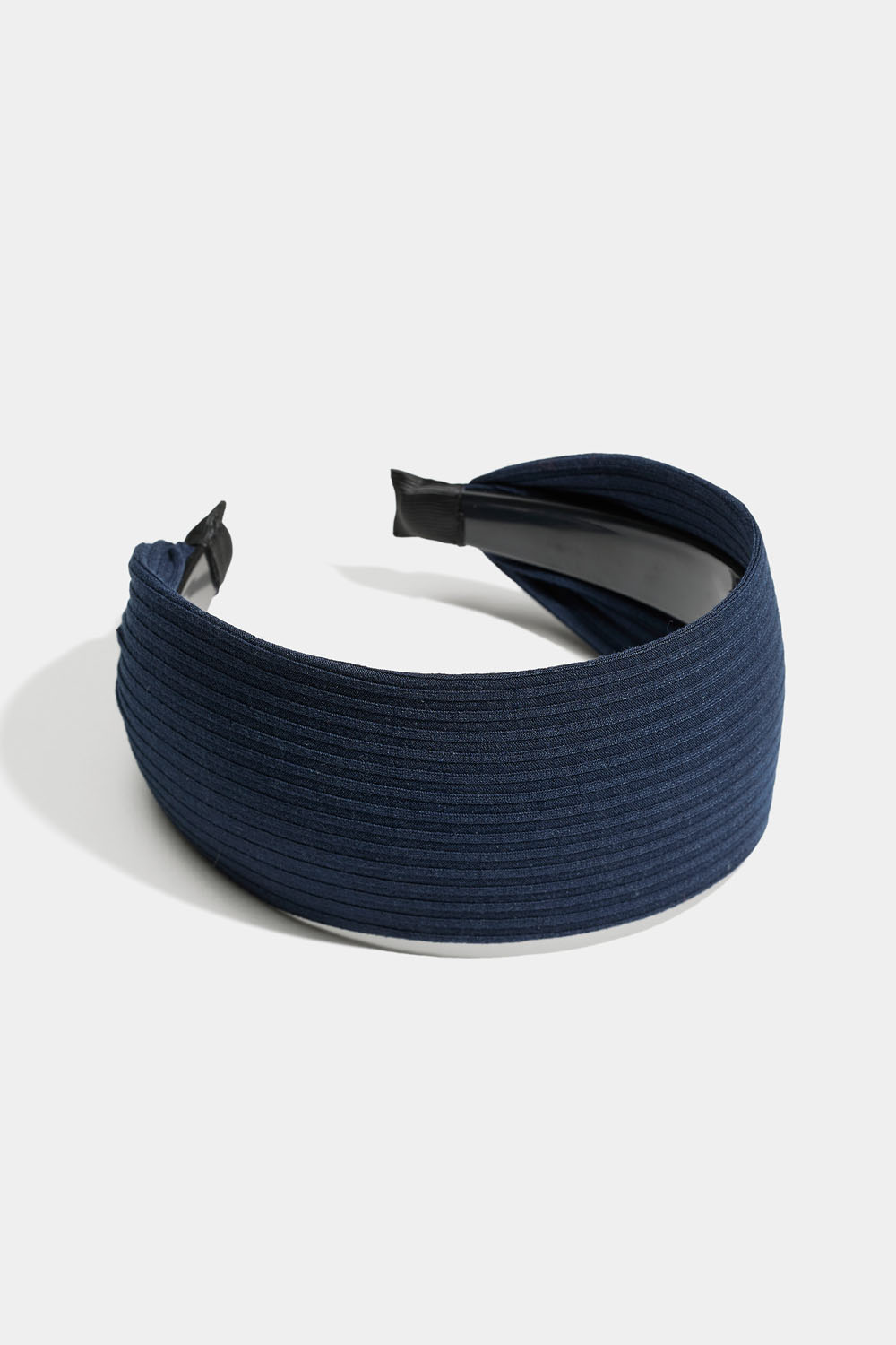 Bred, blåstribet hårbøjle med mærker på indersiden til at holde den på plads.