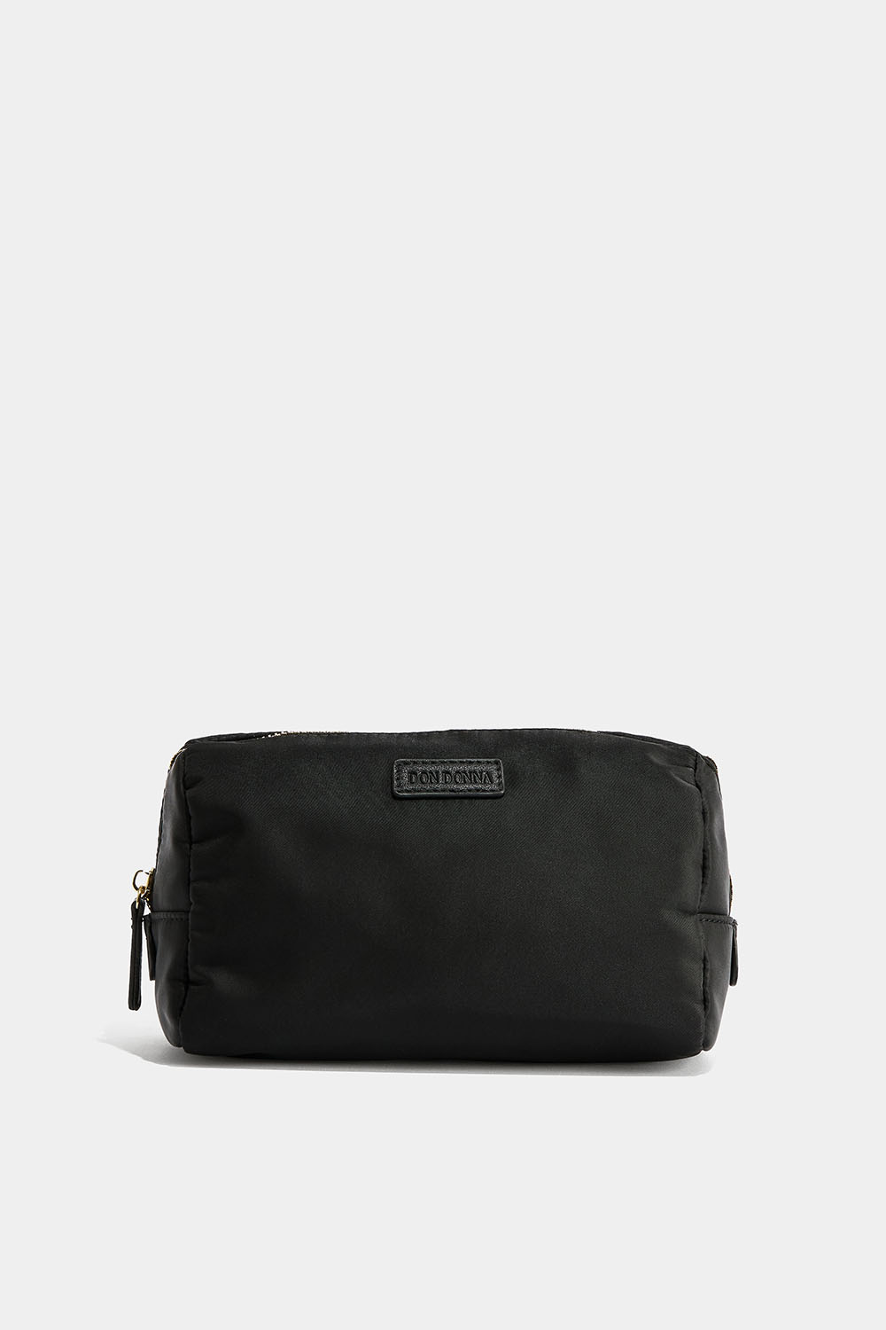 En lille sort toilettaske i let stof, som også kan bruges som makeup-taske. Den lukkes med en guldfarvet lynlås og har et lille indre rum, som også lukkes med lynlås.