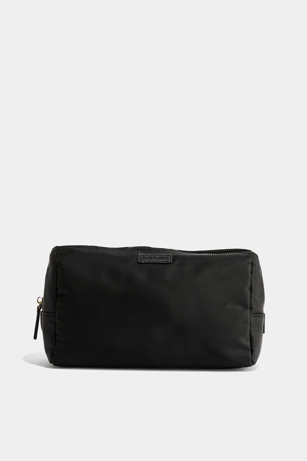 En sort, større toilettaske i let stof med detaljer i imiteret læder. Den lukkes med en guldfarvet lynlås og har et lille indvendigt rum, der lukkes med lynlås.