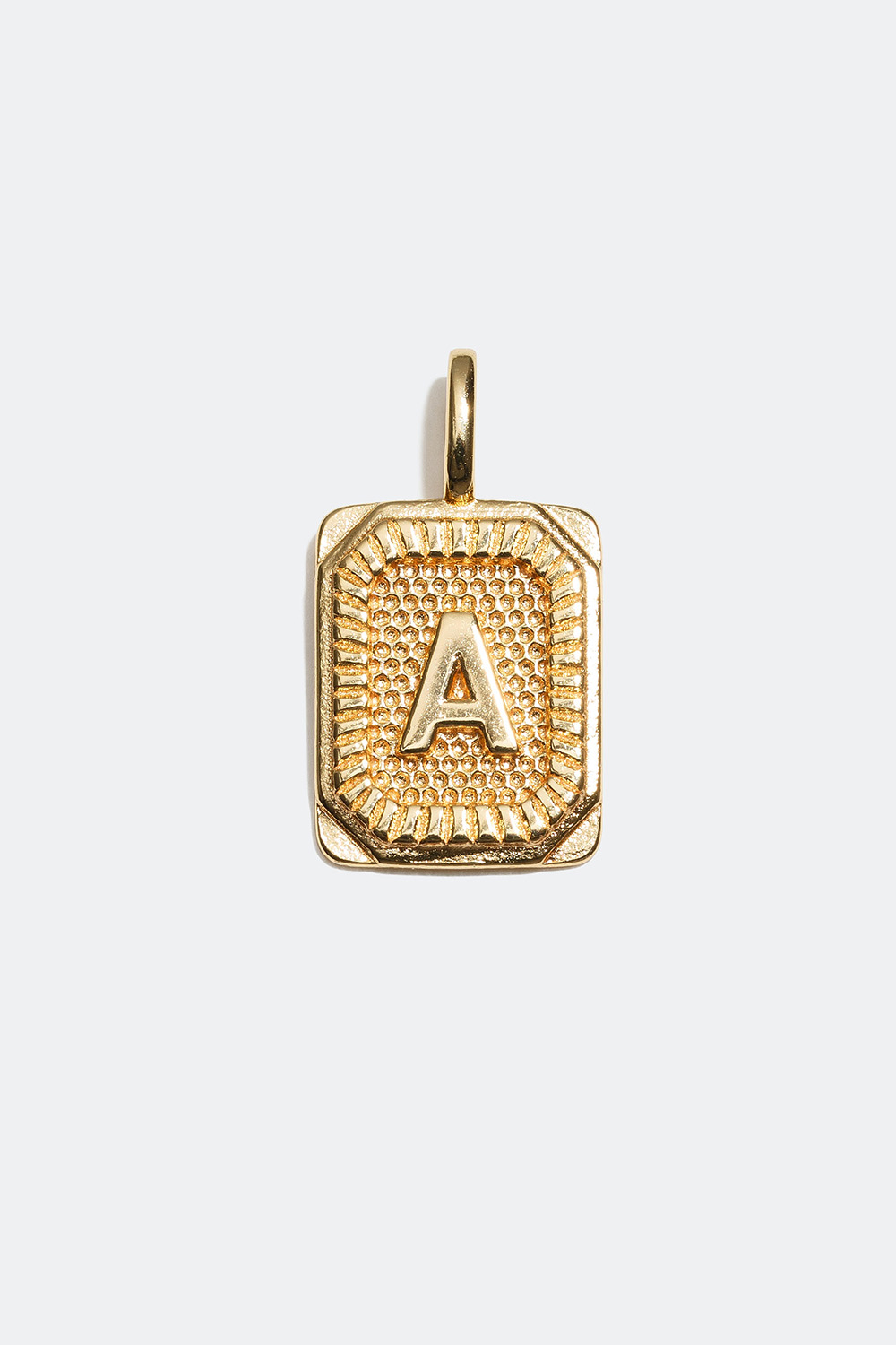 Bogstavvedhæng i form af en rektangulær skive med struktureret og mønstret overflade. Vedhænget er i ægte sølv forgyldt med 18 kt. guld. Vælg mellem flere forskellige bogstaver, og match med en halskæde. Du kan kombinere flere af vores bogstavvedhæng og gøre dit smykke mere personligt ved at skabe navne, ord eller initialer. Et populært smykke, der også er perfekt som gave.