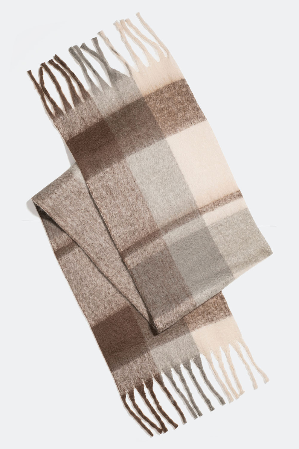 Stort halstørklæde i blød kvalitet med børstet overflade. Tørklædet har en blanding af beige og brune farver i et ternet mønster og har lange frynser på de korte sider.