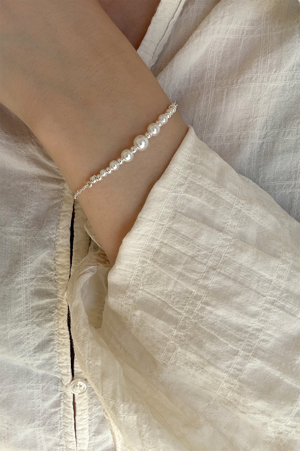 Armbånd med en tynd kæde dekoreret med hvide og sølvfarvede gyldne perler. Længden kan justeres ved hjælp af en gummibelagt guldperle.