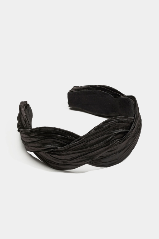 Bred hårbøjle i plisseret sort stof med snoet design.