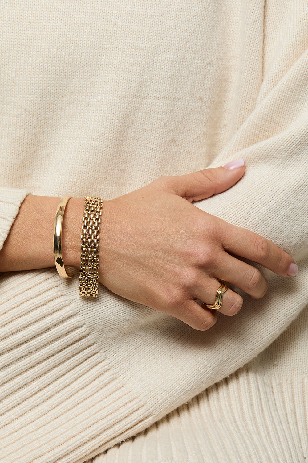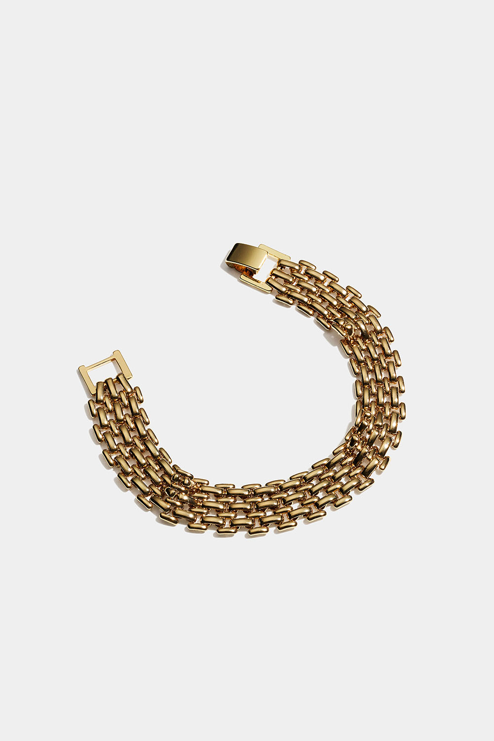 Bredt armbånd i guldfarvet metal med flad stilren kæde.