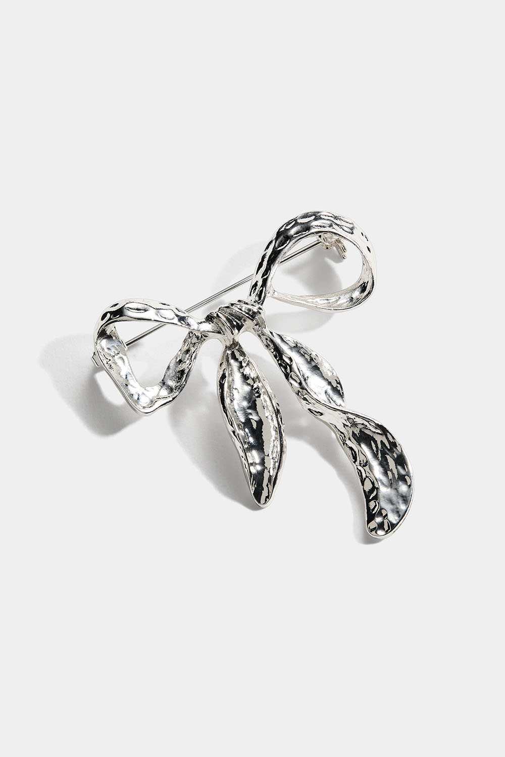 Sølvfarvet metalbroche med en sløjfe med hamret tekstur. Lukkes med en klassisk brochenål.