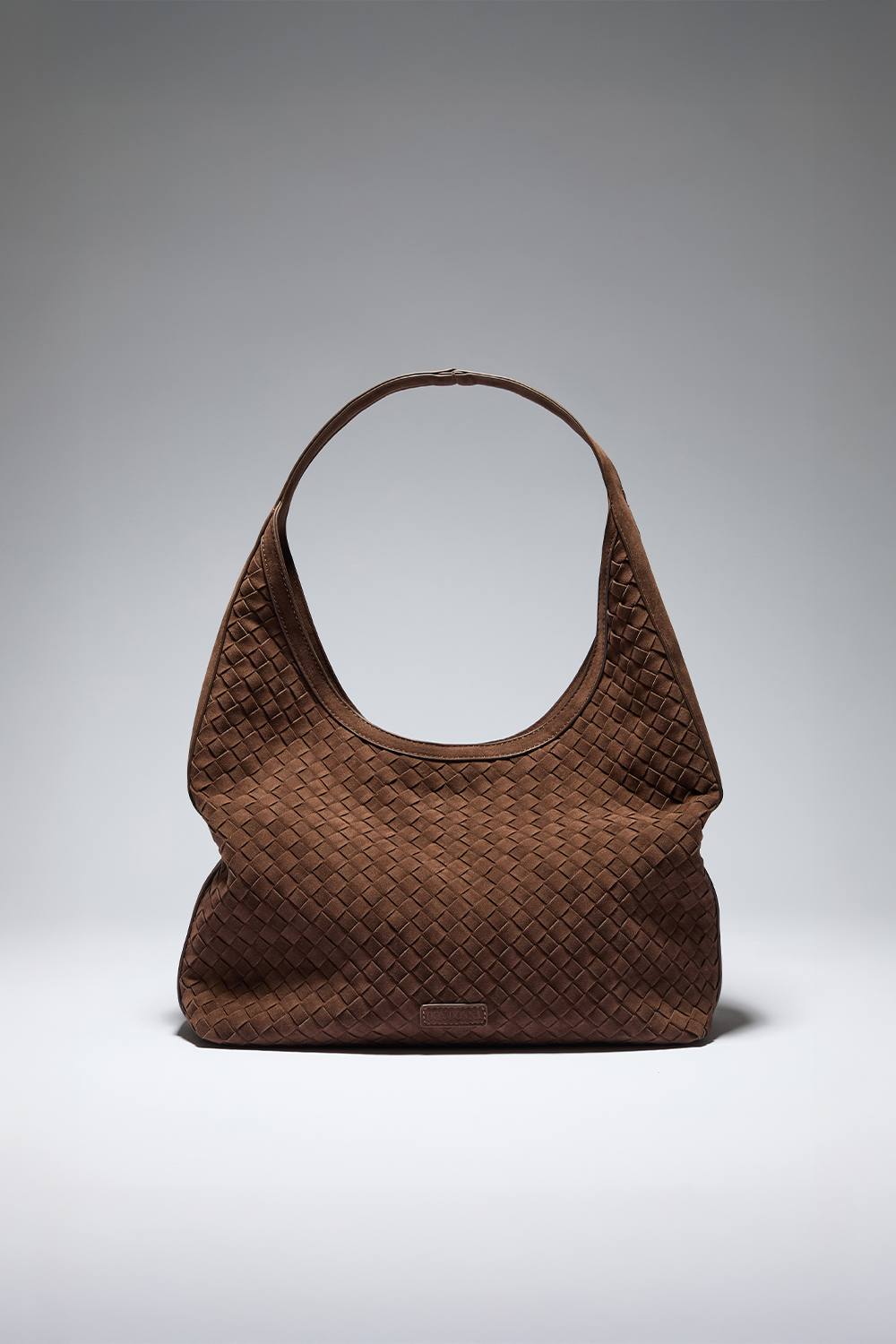Brun taske i imiteret ruskind i hobo-stil med flettet tekstur. Tasken lukkes med magnet og har to mindre rum indvendigt.