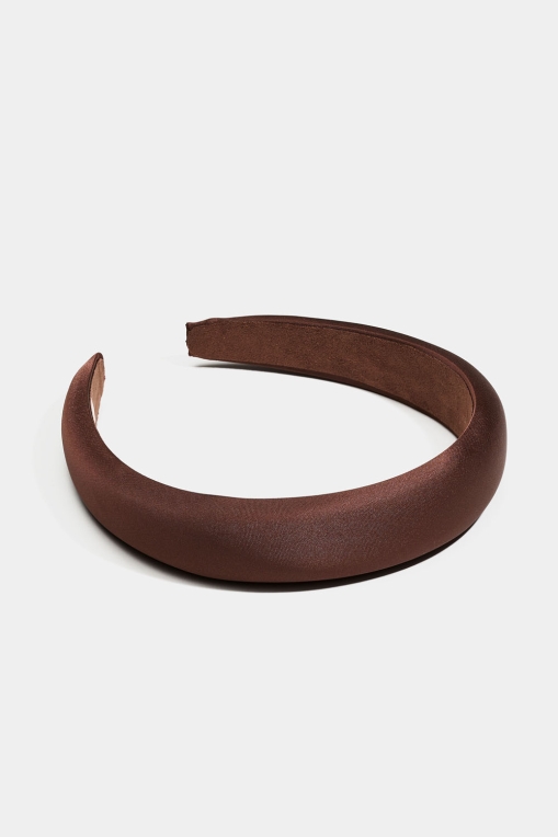 Hårbøjle med polstring og brunt, glansfuldt stof.