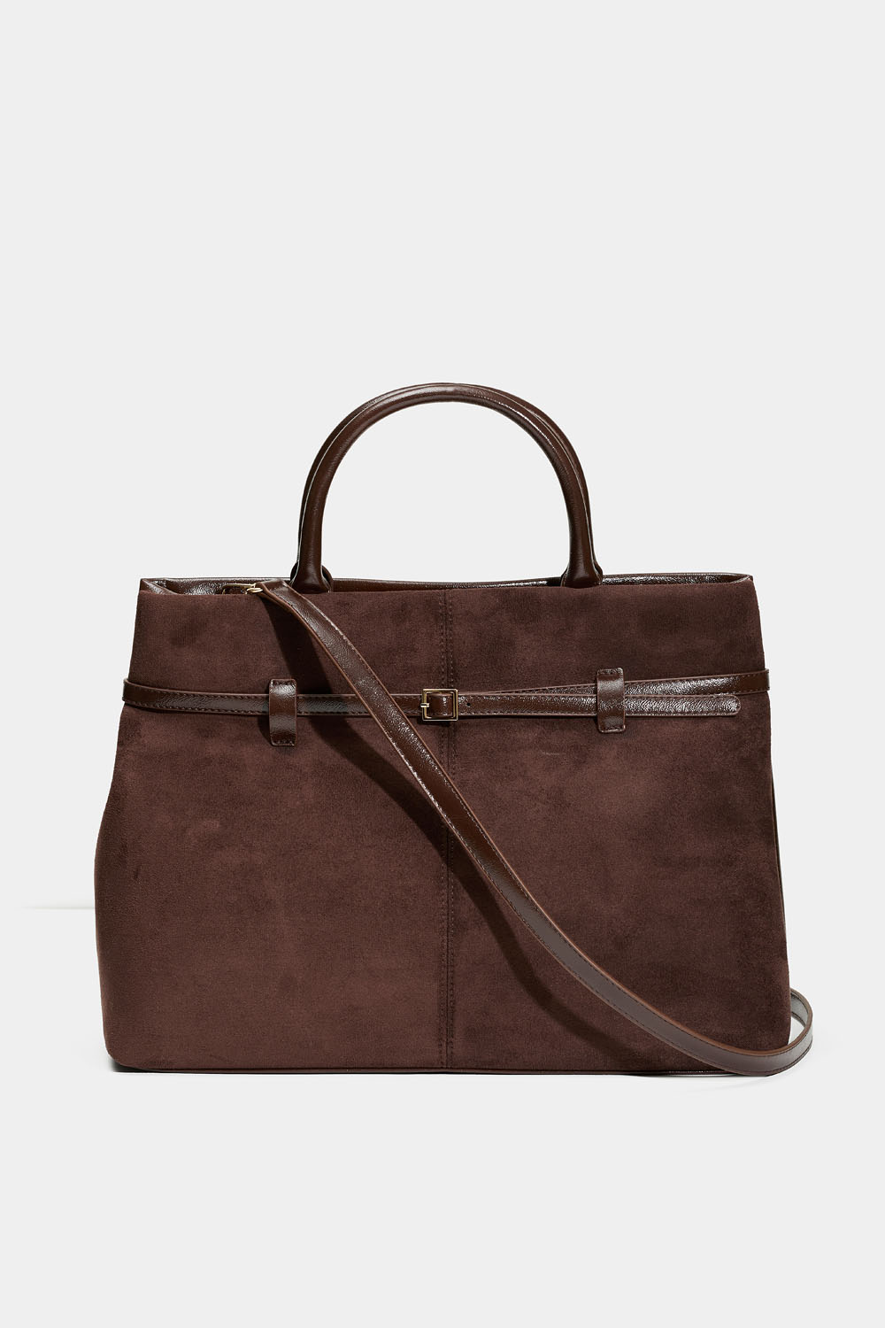 Brun rektangulær taske i imiteret ruskind og læder med et smalt bælte omkring. Tasken har et stort rum, der lukkes med magnet og et mindre rum med lynlås indeni. Der medfølger en justerbar skulderrem.