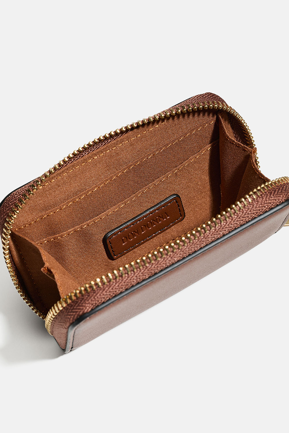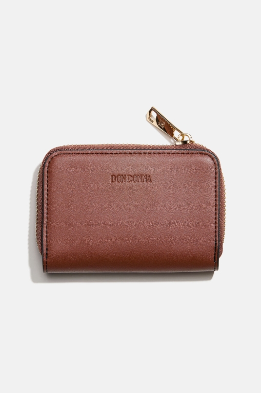 Pung i brunt imiteret læder til kort og sedler med Don Donna-logoet præget foran. Praktisk lille pung med små rum til kort. Pungen lukkes med en lynlås, som holder indholdet sikkert på plads. Stilren pung, der passer perfekt til vores Don Donna-tasker.