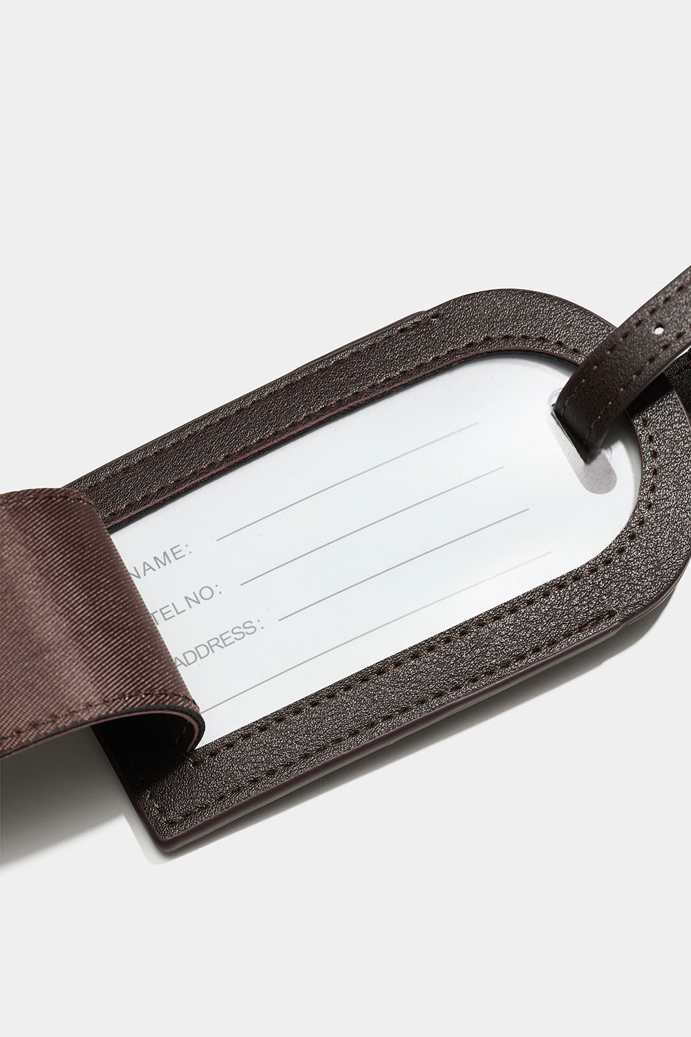 Brunt bagagemærke i imiteret læder, som kan sættes på tasken. Indeni kan du skrive dine oplysninger på den medfølgende adresselabel.