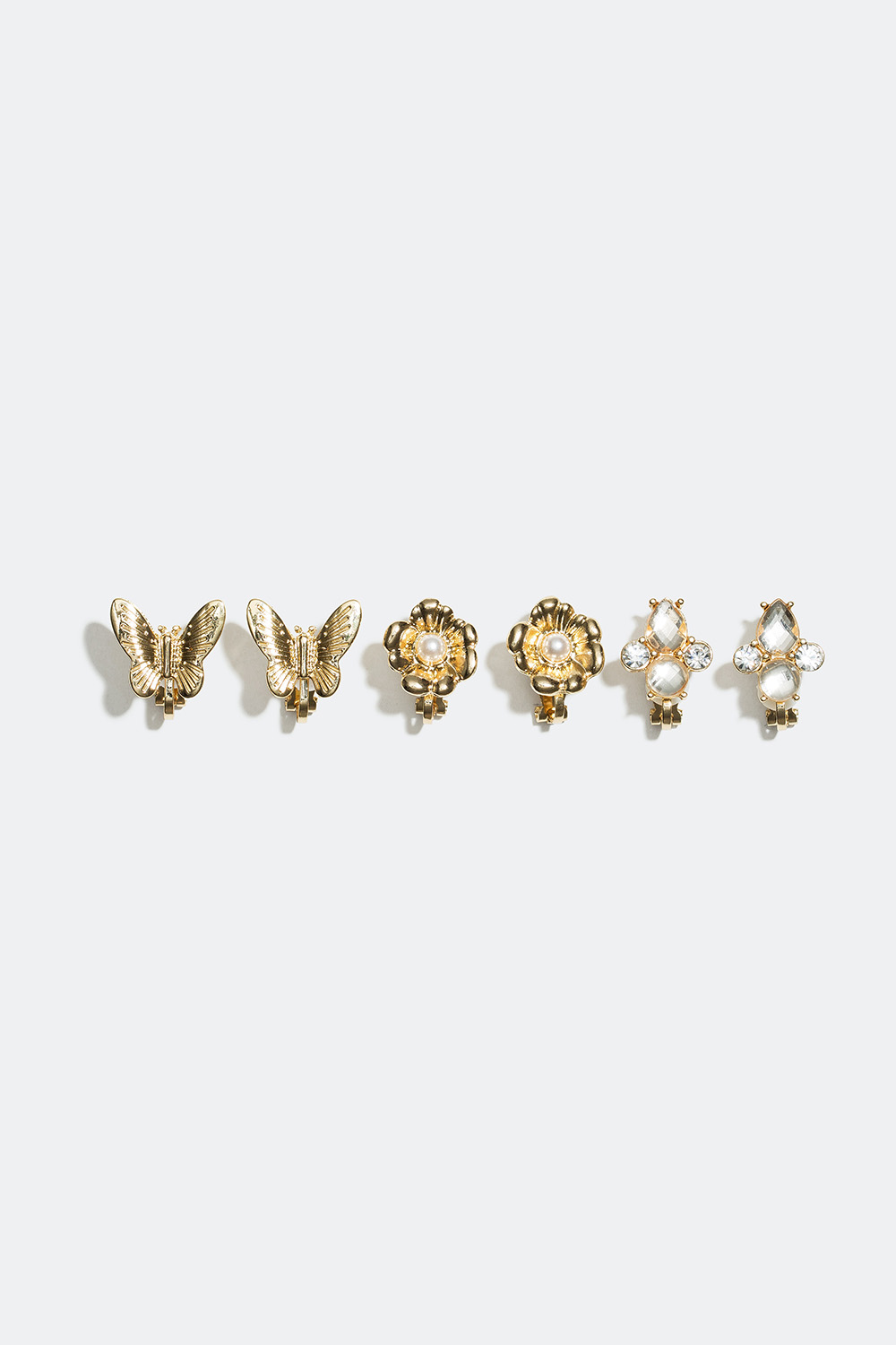 3-pak clips øreringe med motiver af et par sommerfugle, blomster dekoreret med plastperler og et par sammensatte glassten i forskellige former. Perfekt til dig, der ikke har huller i ørerne, men leder efter et par dekorative øreringe.