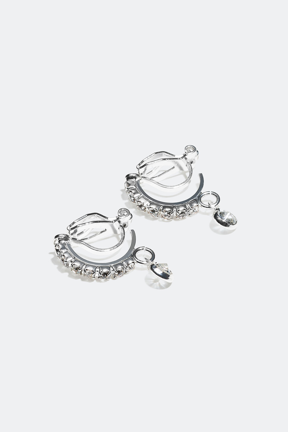 Sølvfarvede clipsøreringe i form af creoler dekoreret med små glassten og med et vedhæng bestående af én rund glassten.
