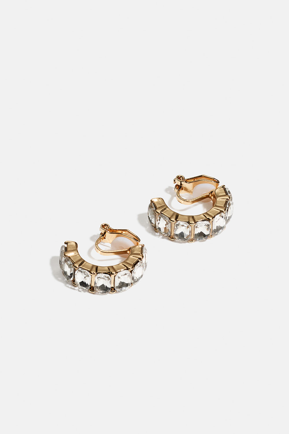 Clipsøreringe med hoops i guldfarvet metal og hvide rektangulære glassten