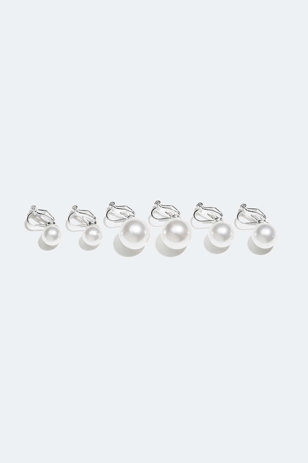 Klassiske og tidløse clipsøreringe med hvide plastperler i tre forskellige størrelser. Pakke med 3 øreringe, der egner sig perfekt til både hverdag og fest.