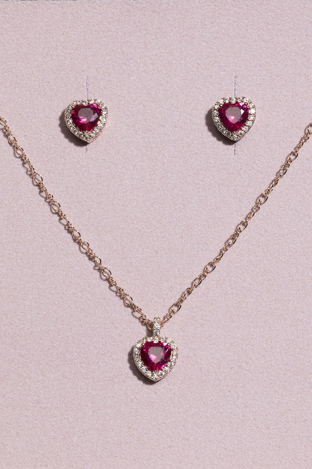 Lyserød er i høj kurs i år, og hvilken bedre måde at fejre det på end at pryde et lyserødt rubinhjerte med fine klare krystaller. Giv dit look et pift af farve med disse søde, iøjnefaldende ørestikker og halskæden i rosaguld.
