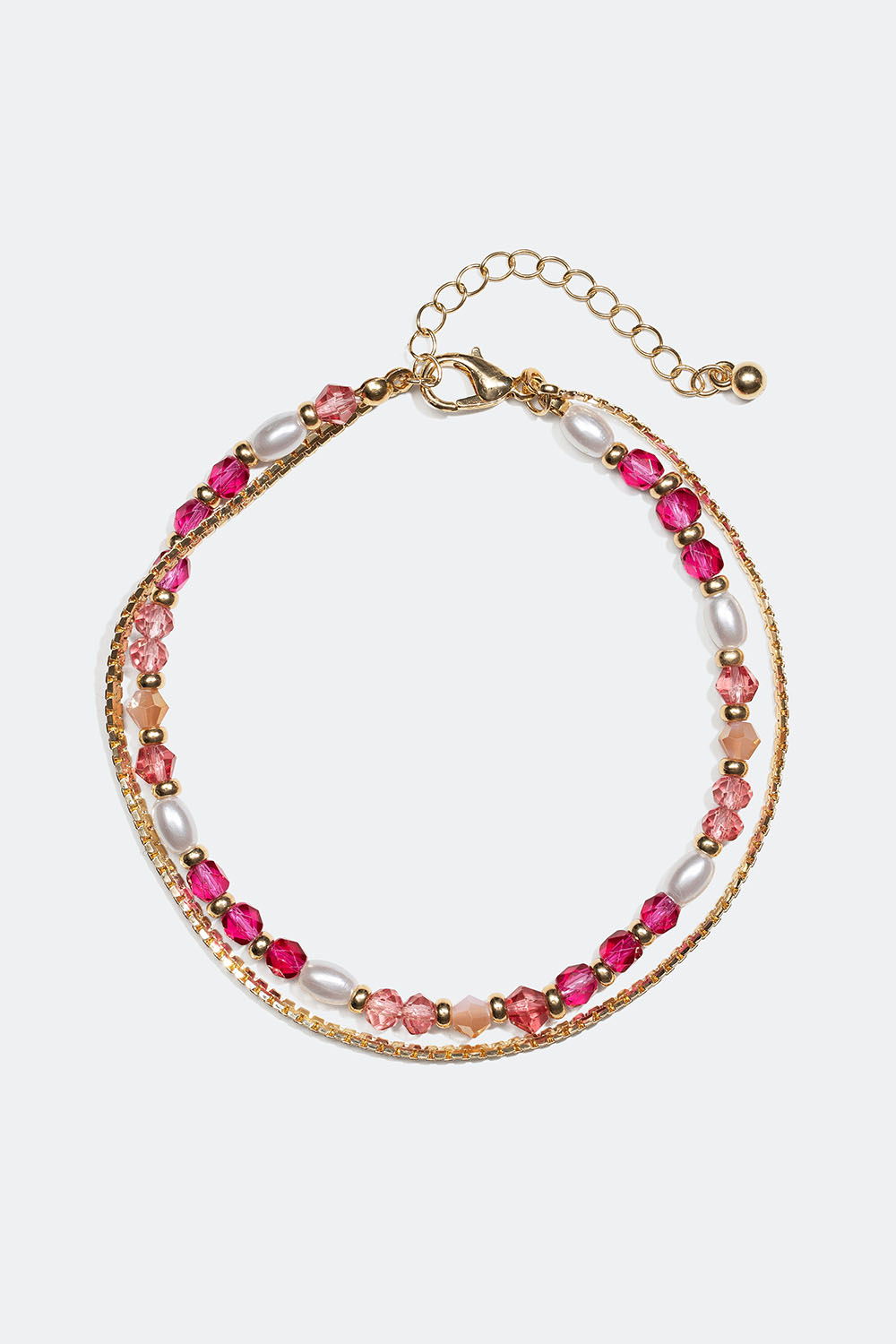 Dobbelt ankelkæde med kæde og perler. Den ene ankelkæde er en flad kæde, og den anden er dekoreret med små perler i en blanding af rosa farver. En perfekt kombination af ankelkæder til sommeren, der tilføjer farve til dit look.