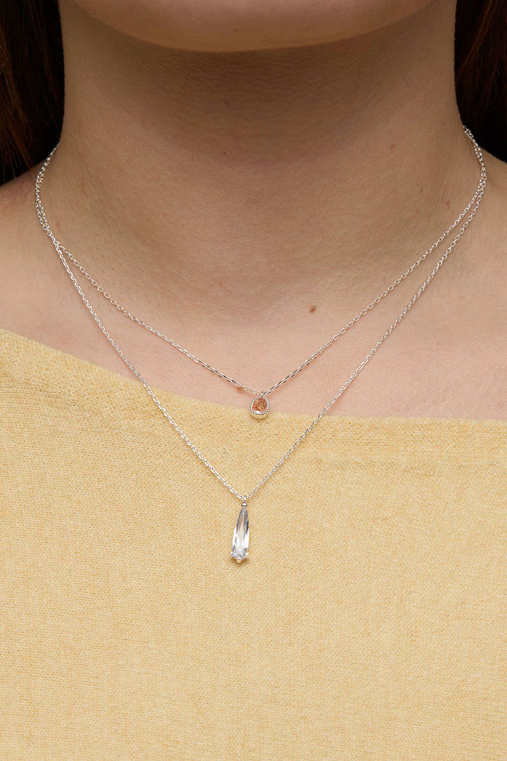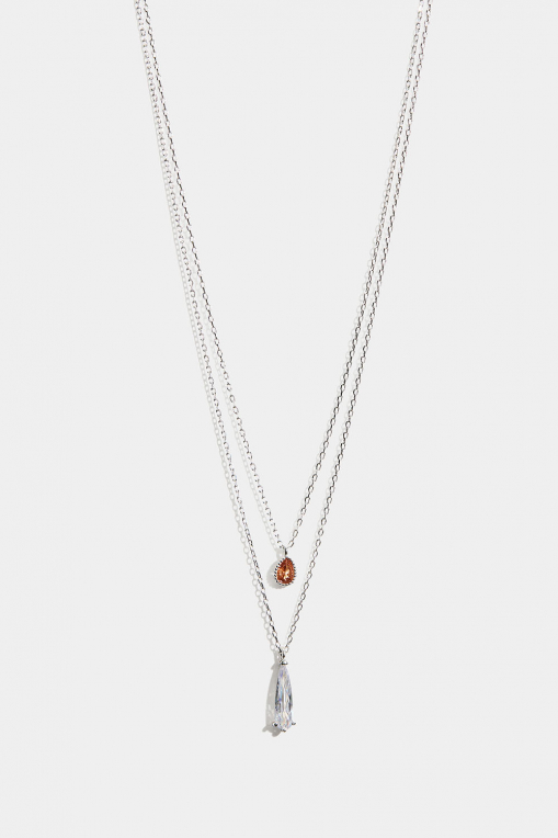 Dobbelt metalhalskæde med to kæder i forskellig længde, hver dekoreret med et vedhæng af en lille beige dråbeformet glassten og en større klar glassten. En stilren halskæde med glitrende detalje, der passer til både hverdag og fest. Kæderne fastgøres i samme lukkeanordning og kan ikke bruges hver for sig.