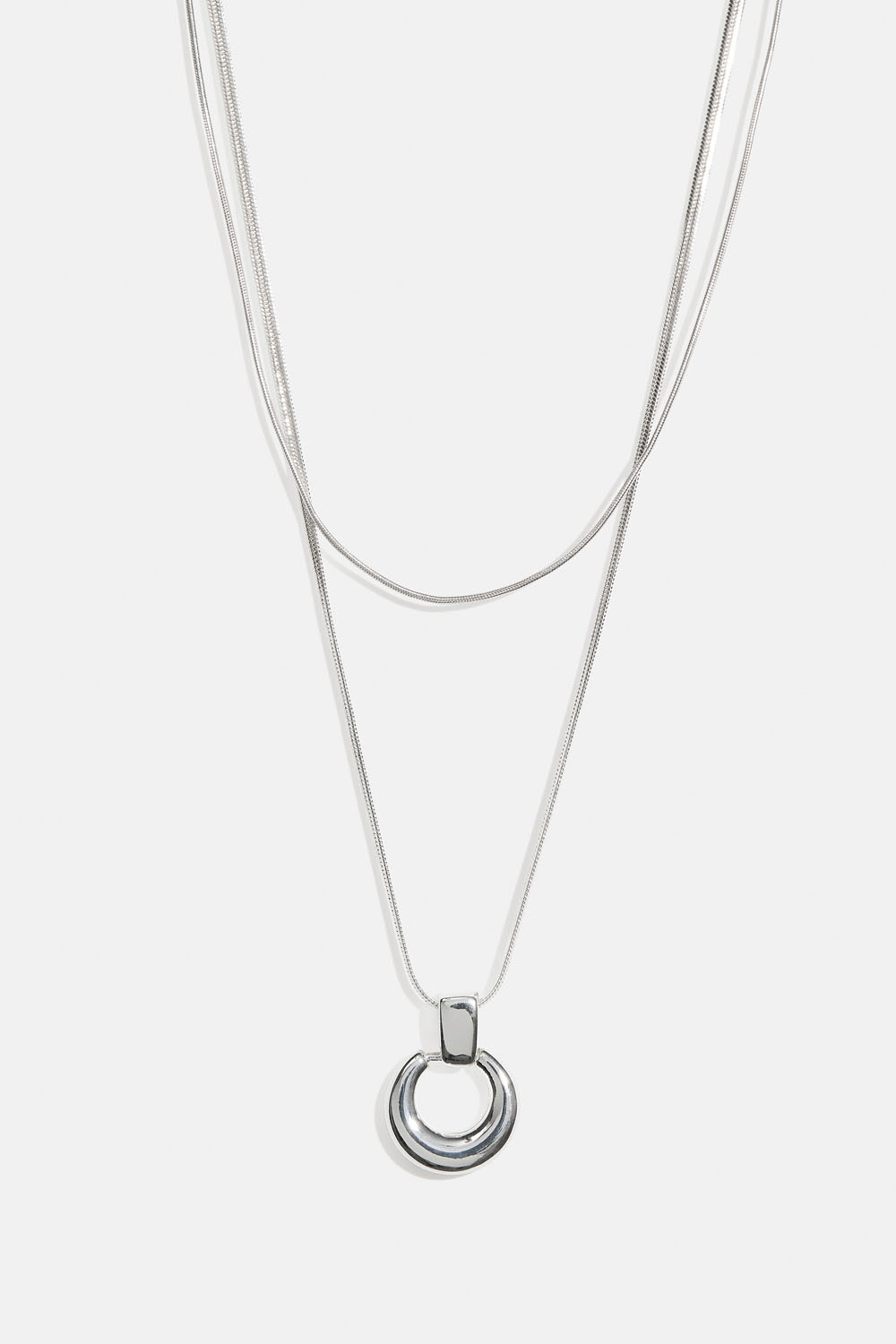 Dobbelt halskæde i to længder med kompakt metalkæde og rundt vedhæng.