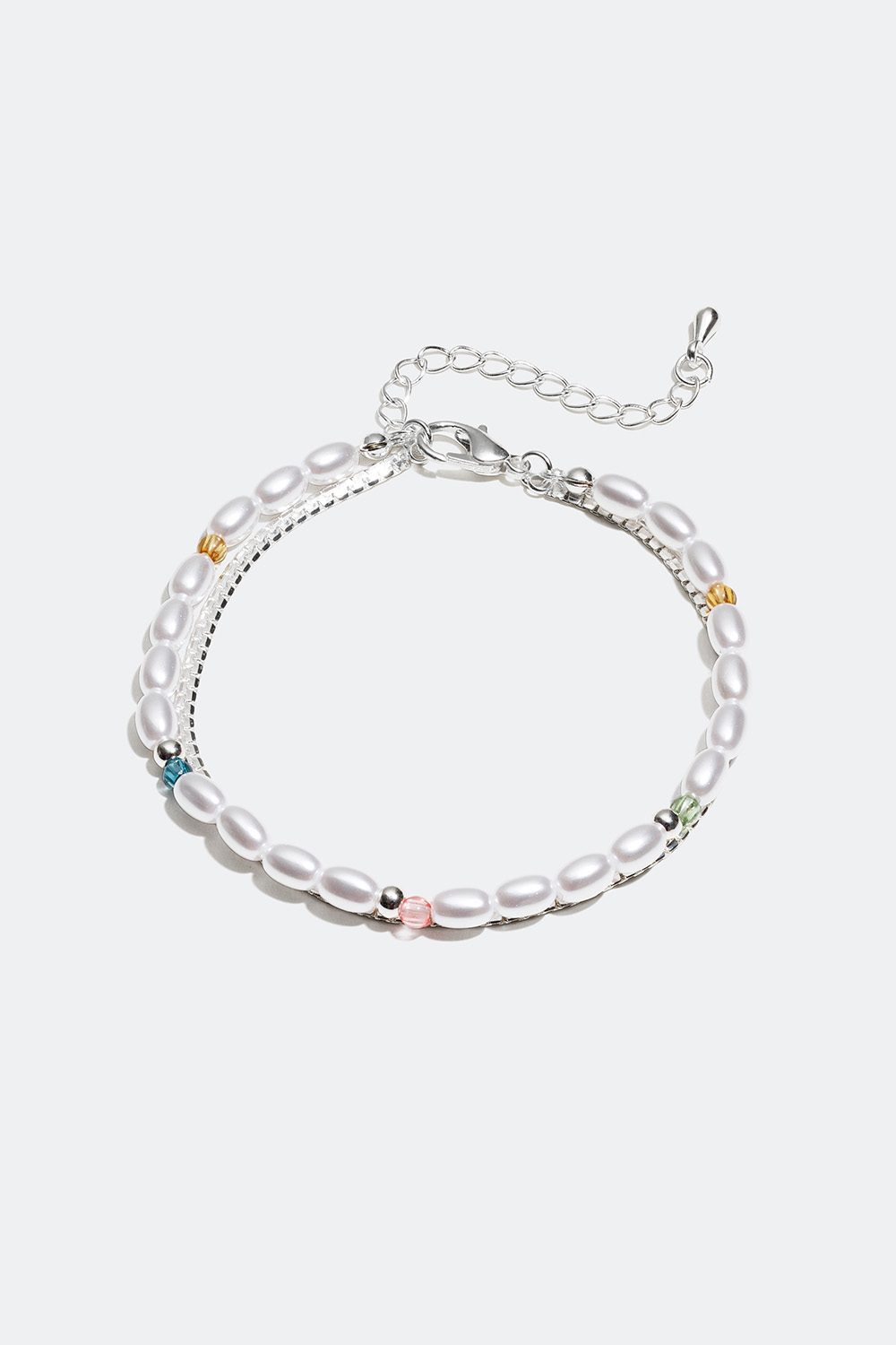 Dobbeltarmbånd med to kæder, der fastgøres i samme lås. Den ene kæde er dekoreret med ovale hvide perler samt små runde pastelfarvede perler i metal. Den anden kæde er en enkel kæde med et fladt design. Et armbånd med sommerstemning, der passer perfekt til både en kjole og en bluse.