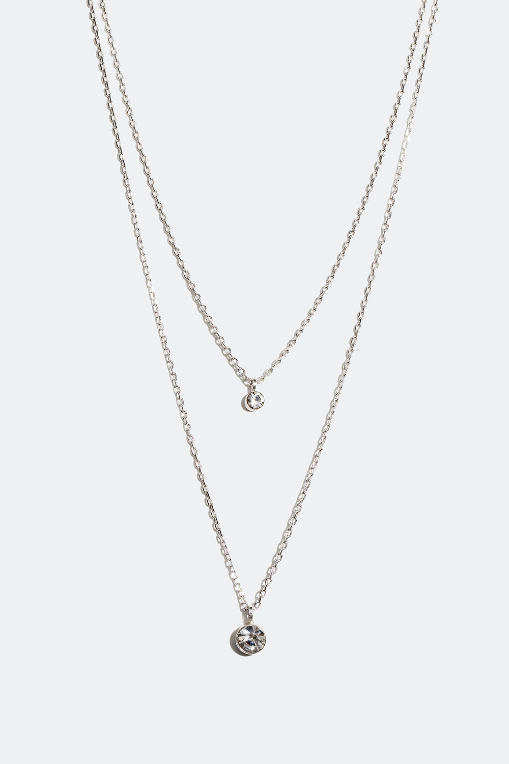 Dobbelthalskæde i metal med to kæder af forskellig længde, hver dekoreret med et vedhæng af en lille rund glassten. En stilren halskæde med glitrende detalje, der passer til både hverdag og fest. Kæderne fastgøres i samme lukkeanordning og kan ikke bruges hver for sig.
