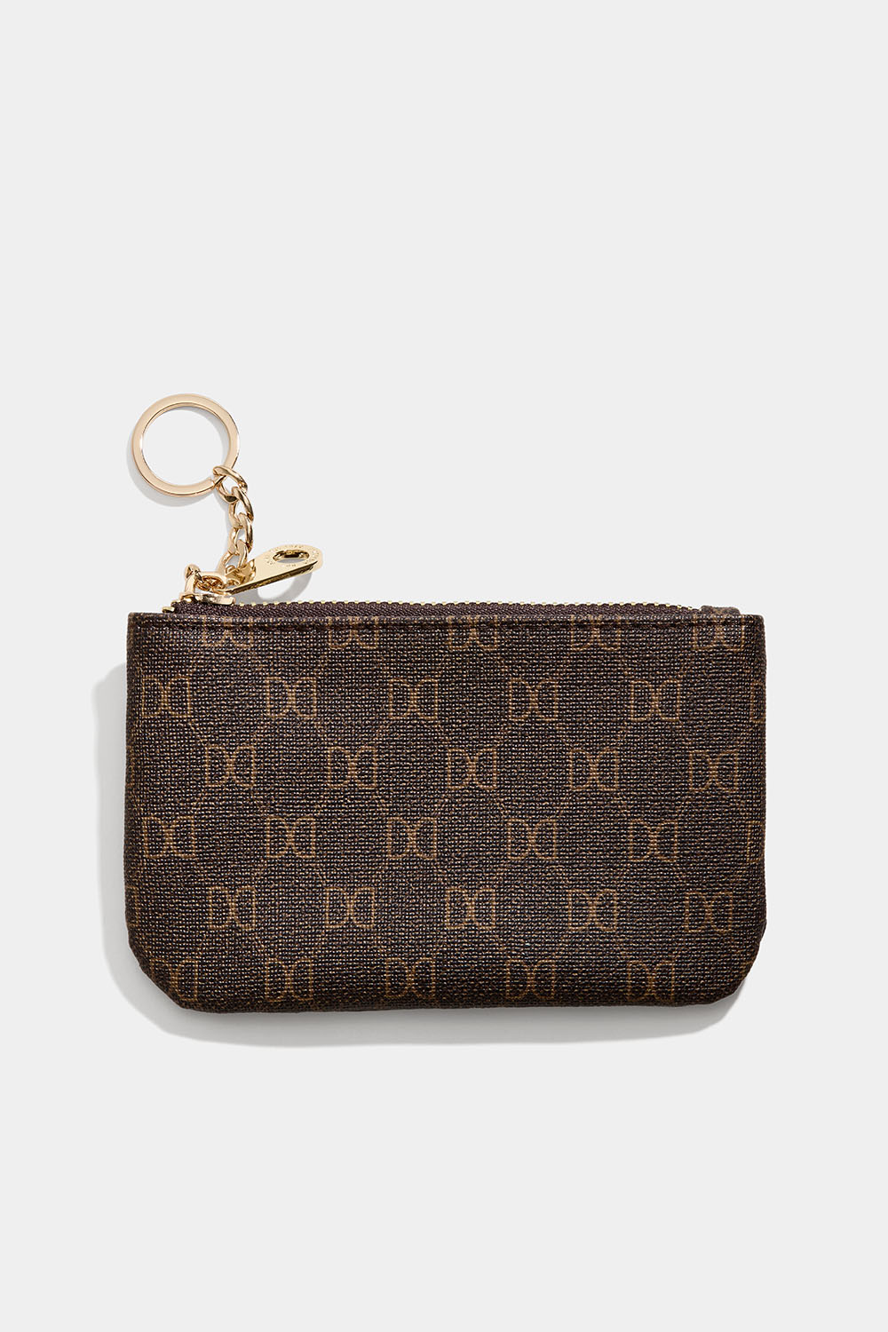 Pung/pung i Don Donnas signaturmønster i brun, med guldfarvede detaljer og kæde med nøglering. Pungen lukkes med lynlås og har to rum indeni.