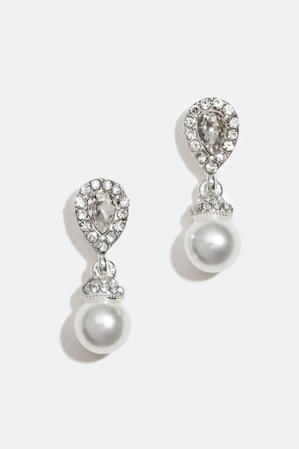 Dråbeformede øreringe prydet med glitrende glassten og hvide glasperler.