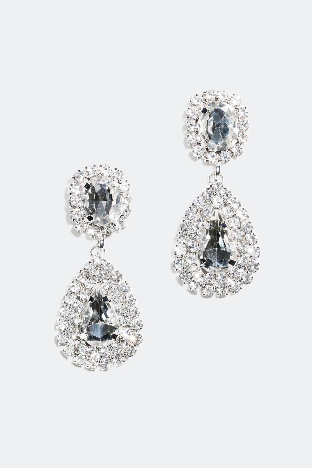 Sølvfarvede dråbeformede statement øreringe. Øreringene er pyntede med små glitrende sten i glas.