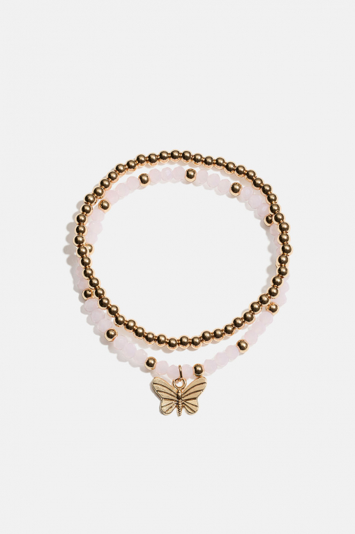 2-pak med elastiske armbånd med lyserøde og guldfarvede perler og et dekorativt sommerfuglevedhæng i metal.