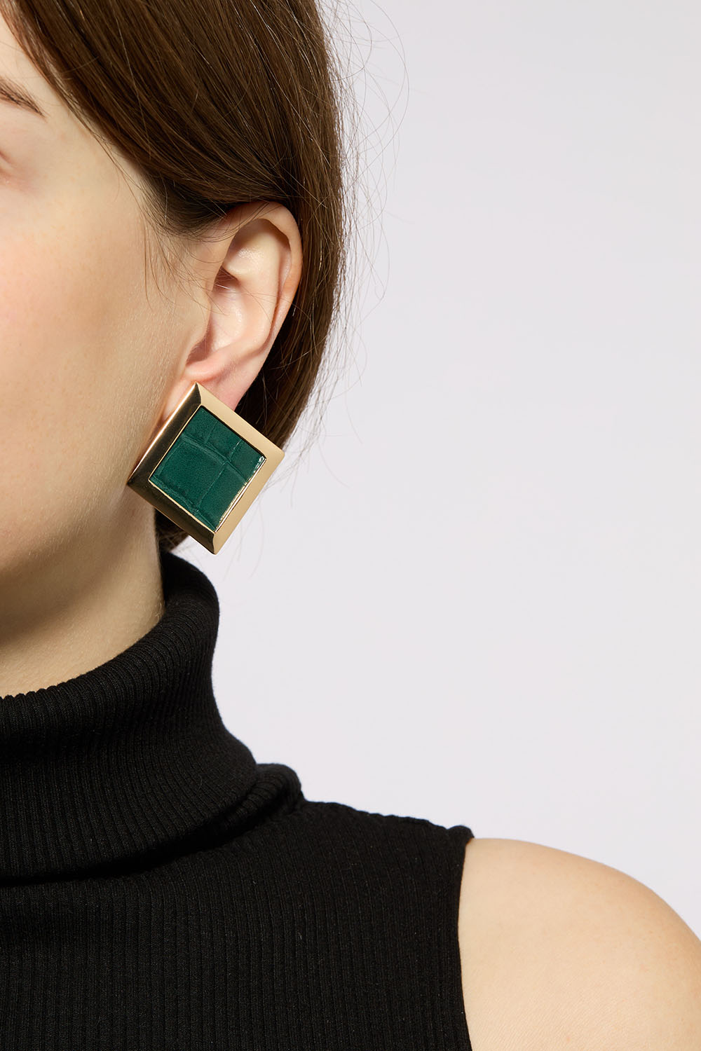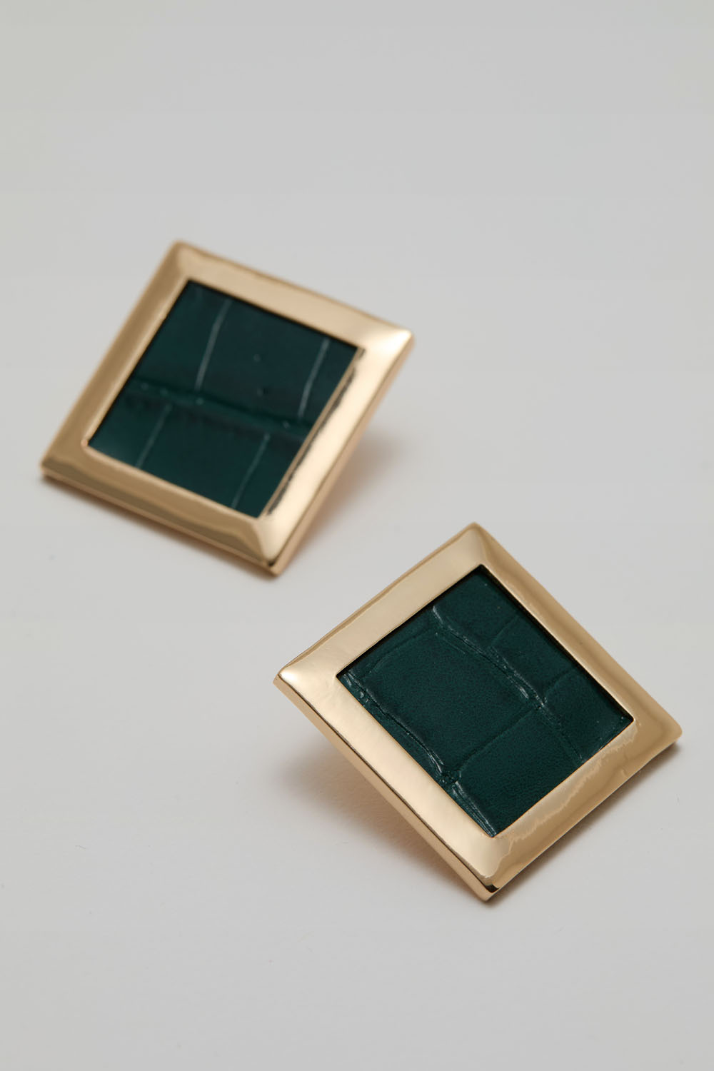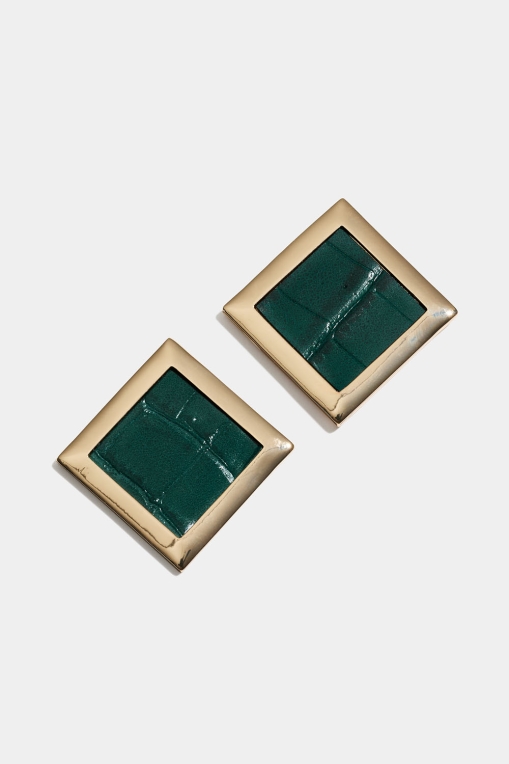 Store firkantede øreringe i guldfarvet metal og grønt imiteret slangeskind