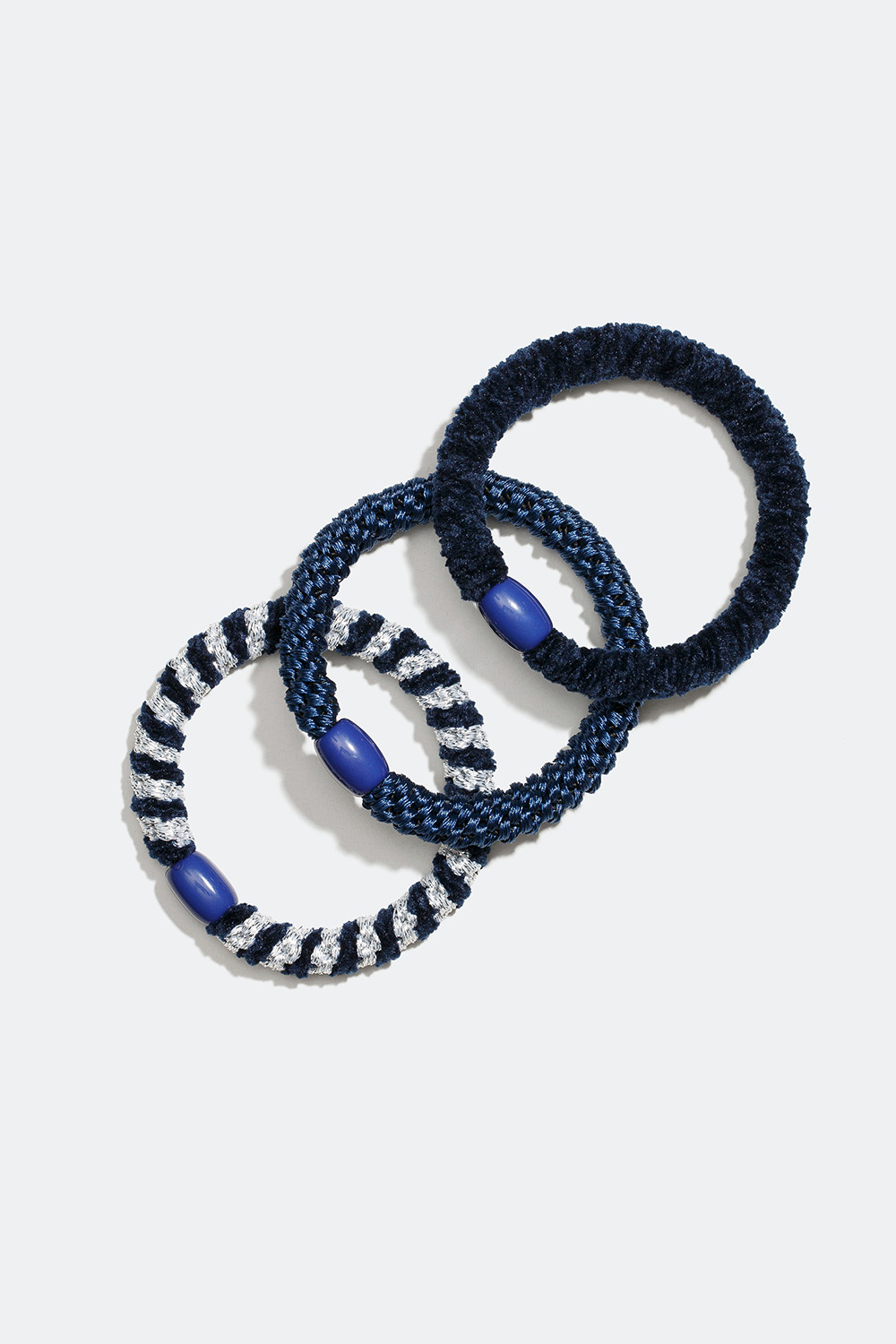 Pakke med 3 kraftige hårelastikker i forskellige blå nuancer med en perledetalje i en matchende farve. Hårelastikkerne er flettet sammen af små elastiktråde, hvilket gør dem ekstra elastiske og meget skånsomme mod håret. Når du ikke bruger dem i håret, er de pæne bare at have om håndleddet.