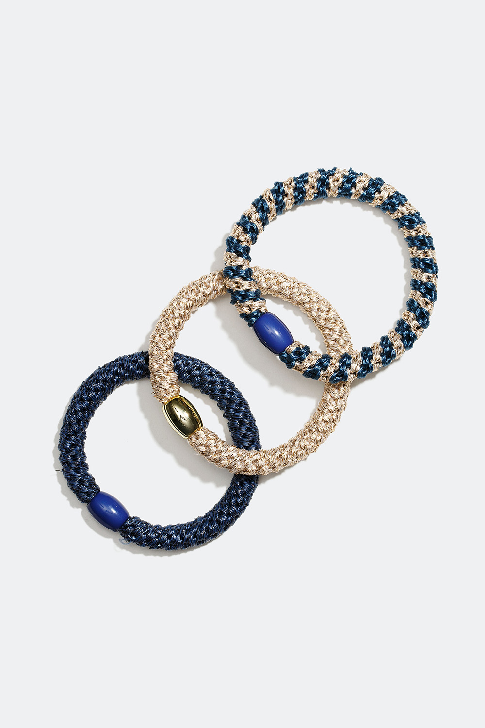 Pakke med 3 kraftige hårelastikker i forskellige nuancer af blå og guld med en perledetalje i en matchende farve. Hårelastikkerne er flettet sammen af små elastiktråde, hvilket gør dem ekstra elastiske og meget skånsomme mod håret. Når du ikke bruger dem i håret, er de pæne bare at have om håndleddet.