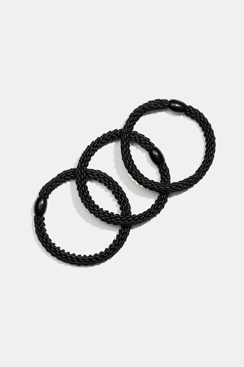 Pakke med 3 kraftige hårelastikker i forskellige farver med en perledetalje i en matchende farve. Hårelastikkerne er flettet sammen af små elastiktråde, hvilket gør dem ekstra elastiske og meget skånsomme mod håret. Når du ikke bruger dem i håret, pynter de at have på rundt om håndleddet.