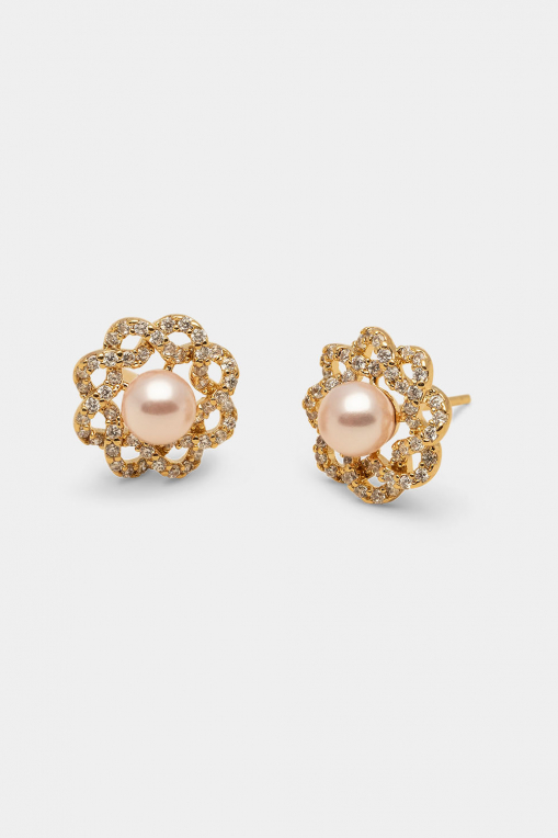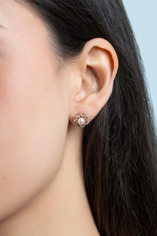 Vores Fleur-øreringe har en strålende rosenfarvet perle i midten, indrammet af fine bladdetaljer dekoreret med små klare sten. Et tidløst og elegant design, perfekt til både hverdag og fest.