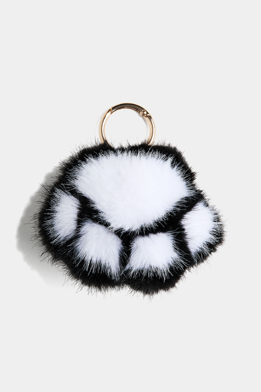 Nøglering med vedhæng i form af en pote i sort fluffy stof med hvide trædepuder.
