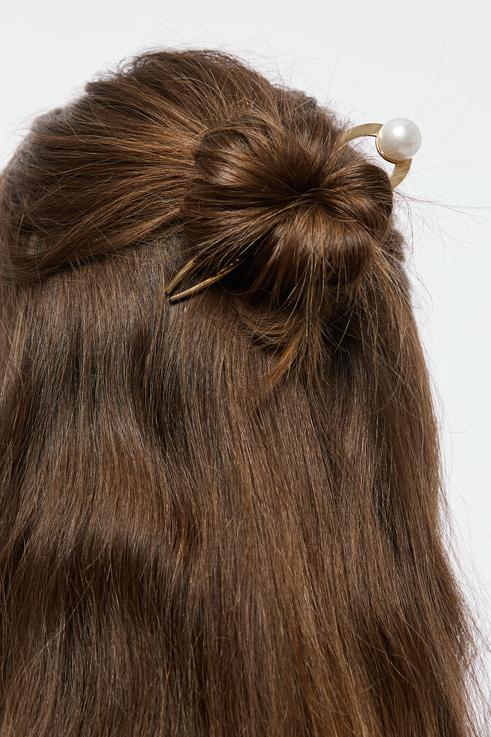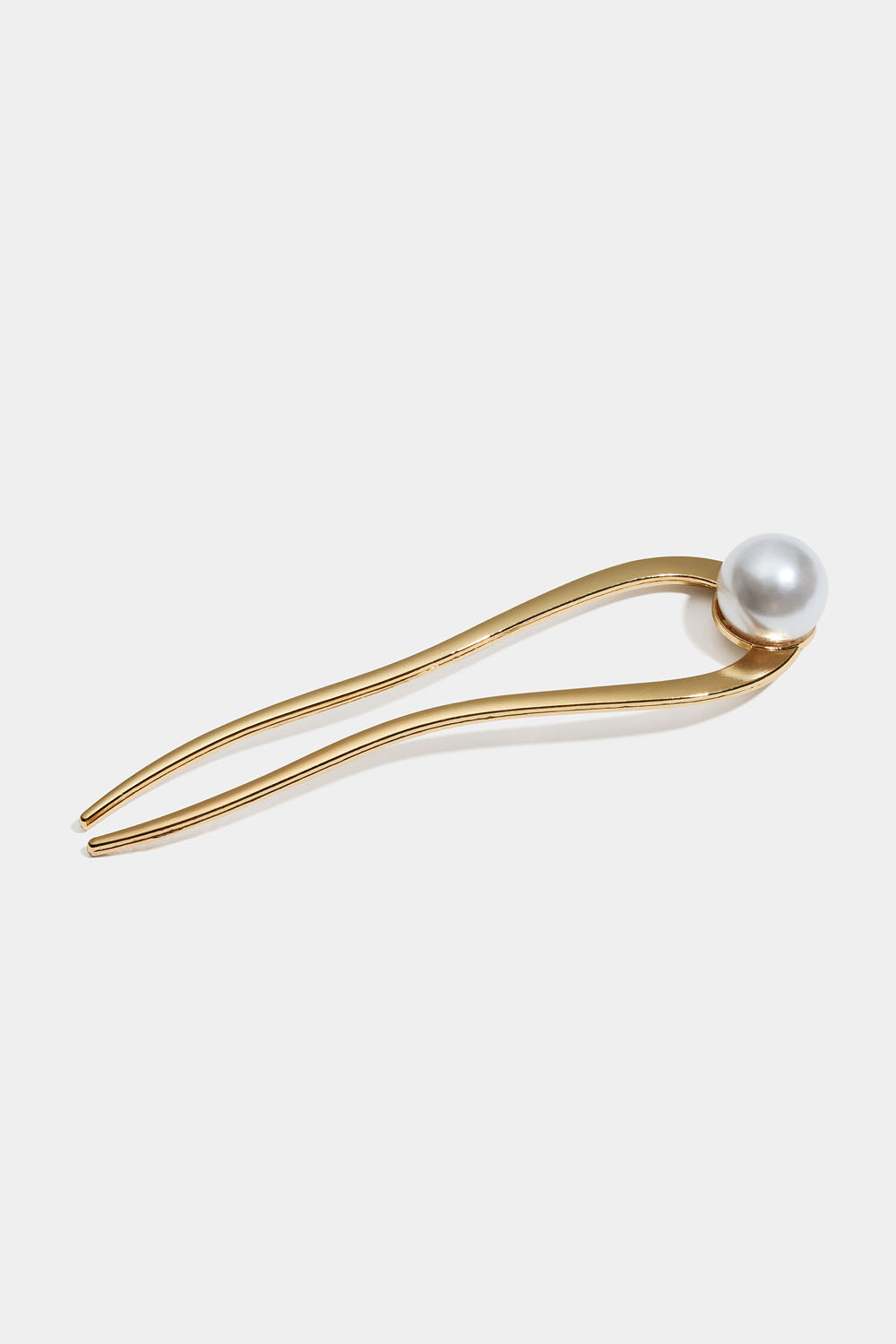 Fransk hårnål i guldfarvet metal dekoreret med en stor, hvid perle.