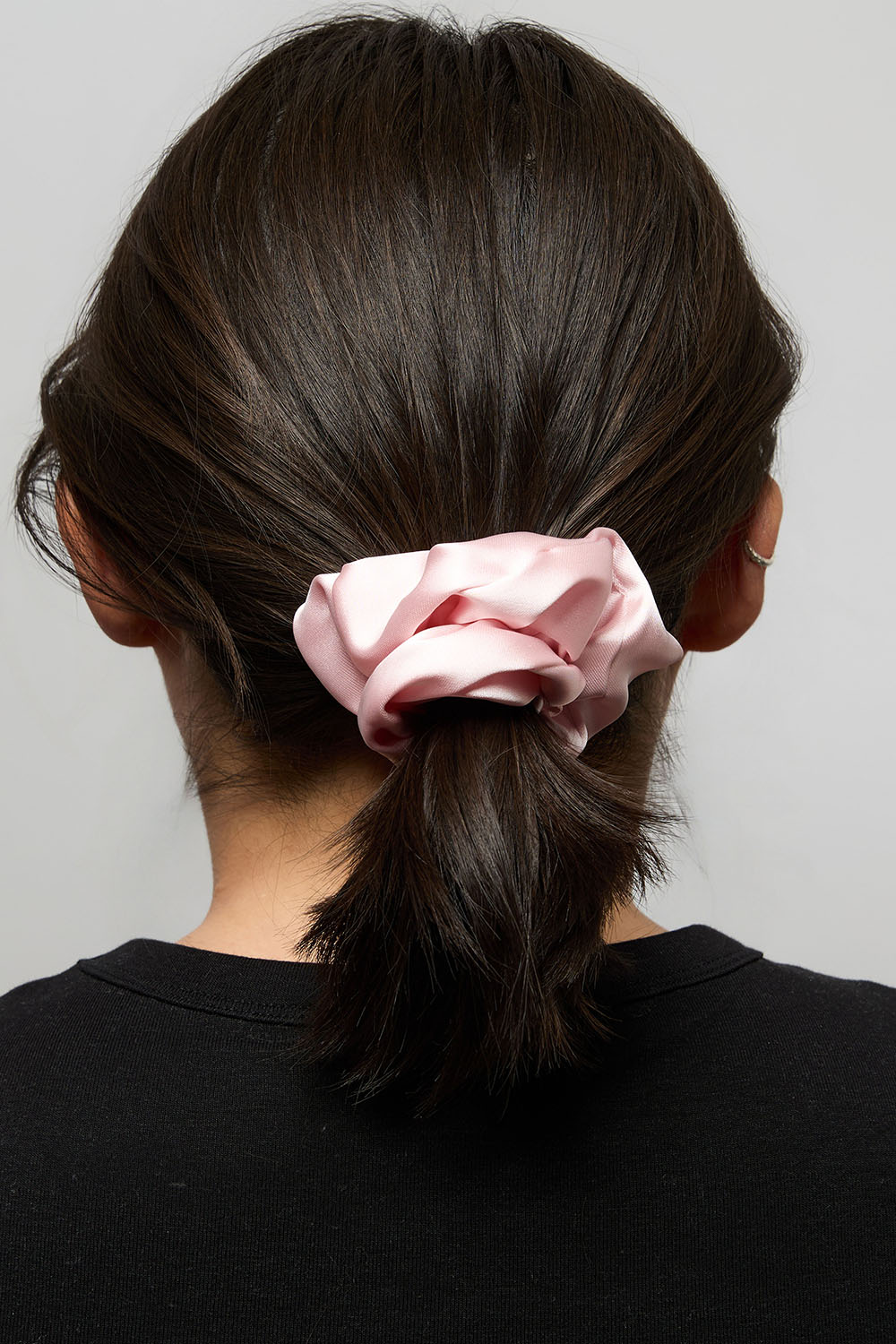 Lille, lyserød scrunchie i skinnende imiteret silke. Klassisk hårtilbehør, der er skånsom mod håret.